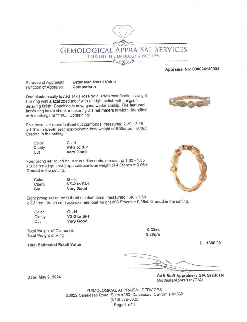 This 14KT rose gold fashion ring features a scalloped motif with milgrain detailing and a bright polish finish. It is set with five bezel-set round brilliant cut diamonds totaling 0.19ct, four prong-set diamonds totaling 0.06ct, and eight additional prong-set diamonds totaling 0.08ct. The diamonds are G-H color, VS-2 to SI-1 clarity, and have a very good cut. The ring weighs 2.30 grams.
