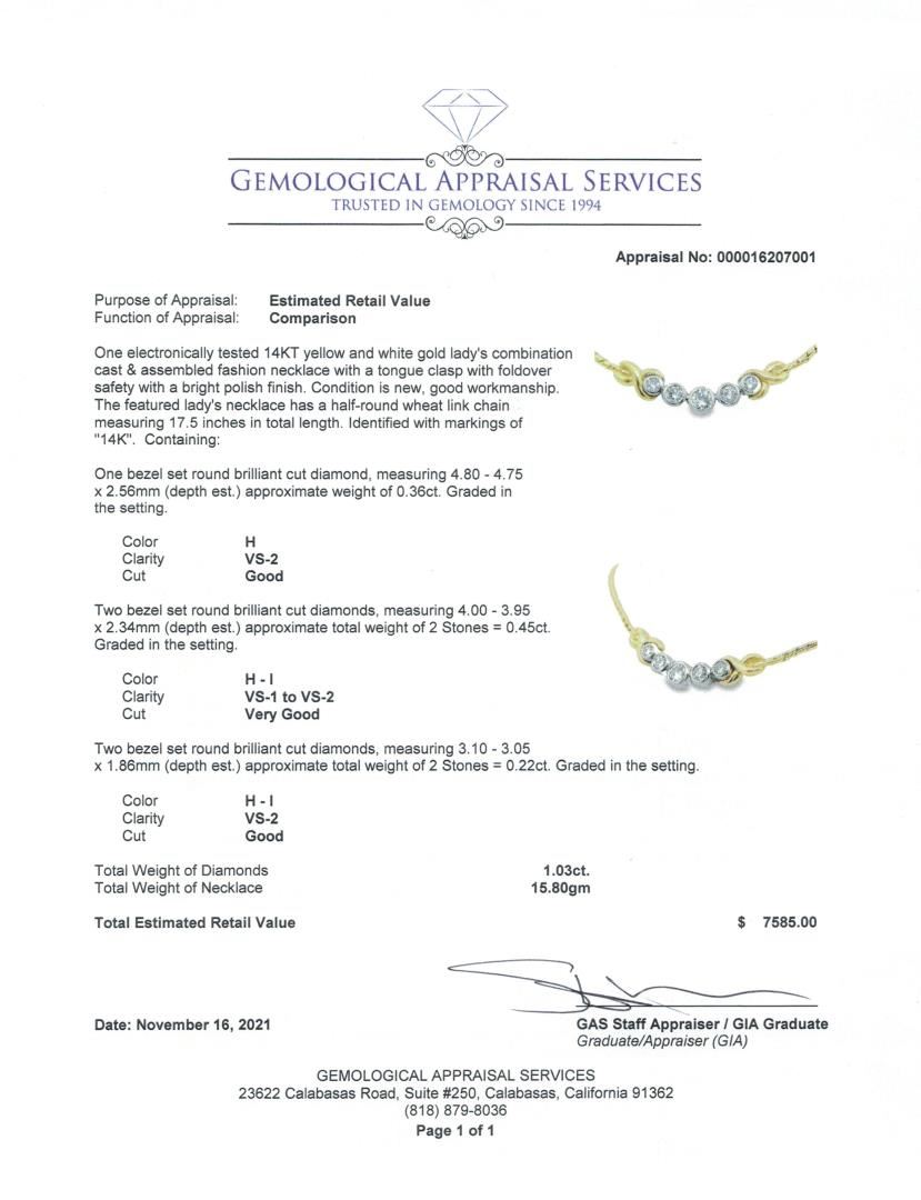 This elegant 14KT yellow and white gold necklace features a half-round wheat link chain measuring 17.5 inches. The centerpiece consists of five bezel-set round brilliant-cut diamonds, including a central diamond weighing 0.36ct, flanked by additional diamonds totaling 1.03ct. The combination of polished metals and well-matched stones creates a balanced and refined design.