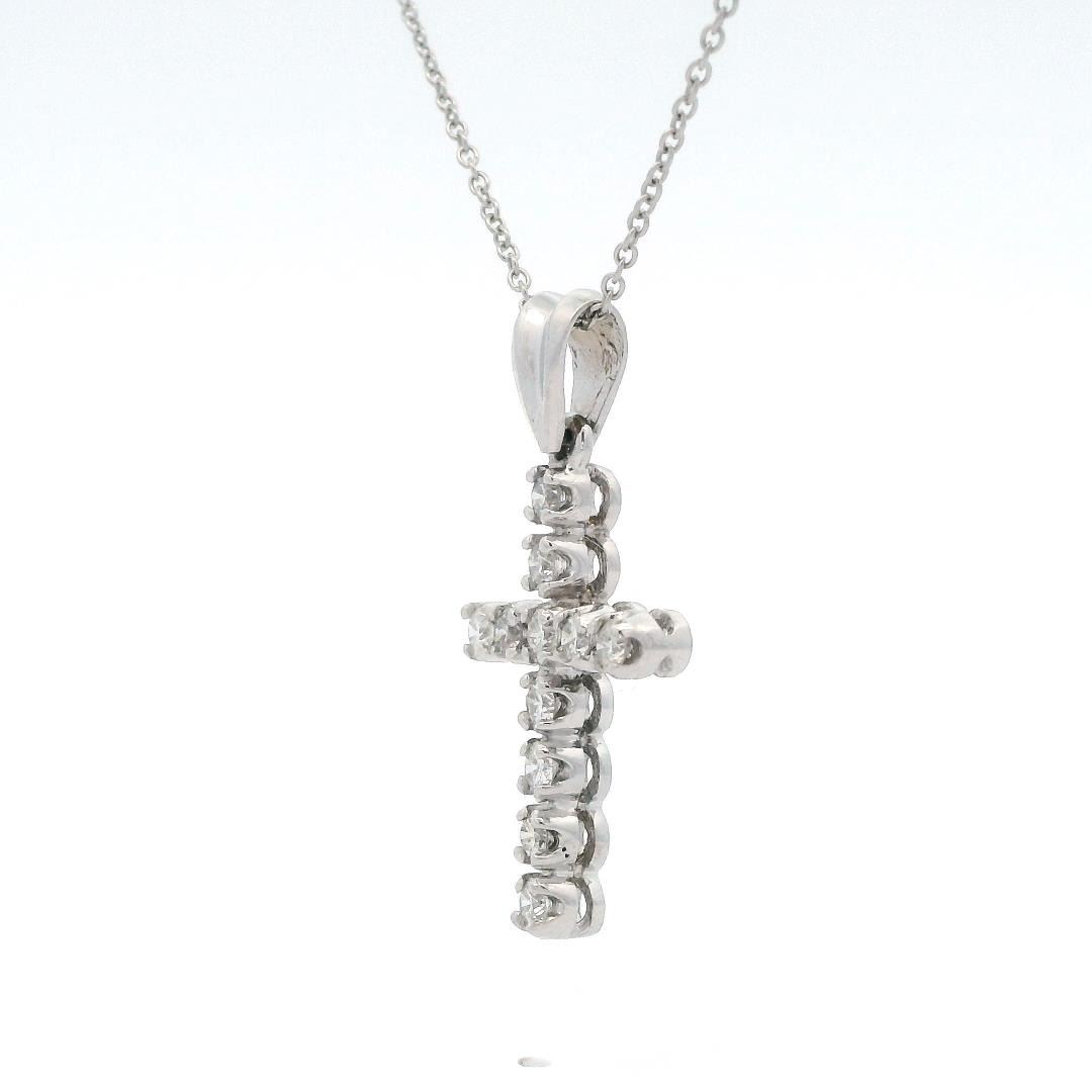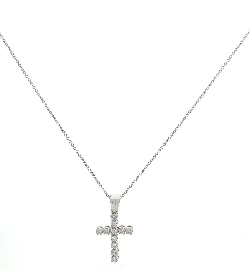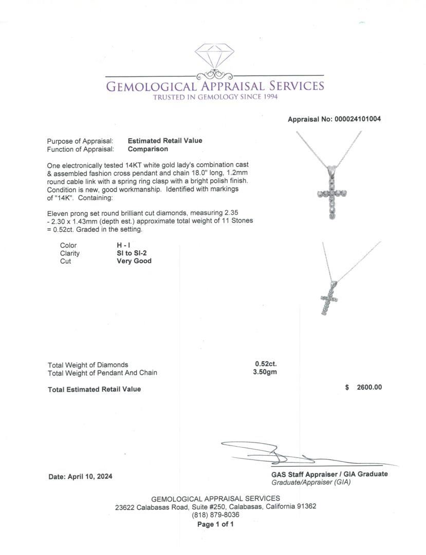 A classic 14KT white gold cross pendant necklace, featuring eleven prong-set round brilliant-cut diamonds totaling 0.52ct. The diamonds, graded H-I in color and SI to SI-2 in clarity, enhance the pendant's radiant appeal. It is suspended from an 18-inch round cable link chain with a spring ring clasp.