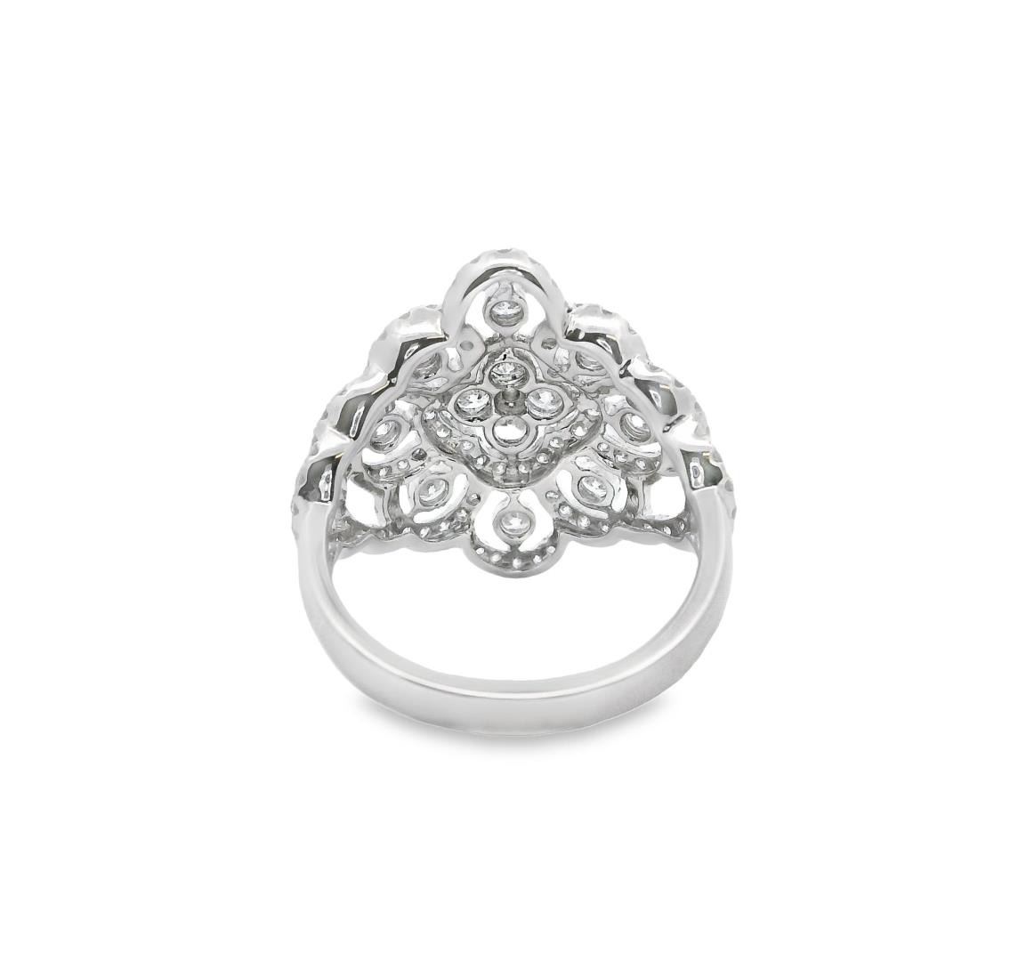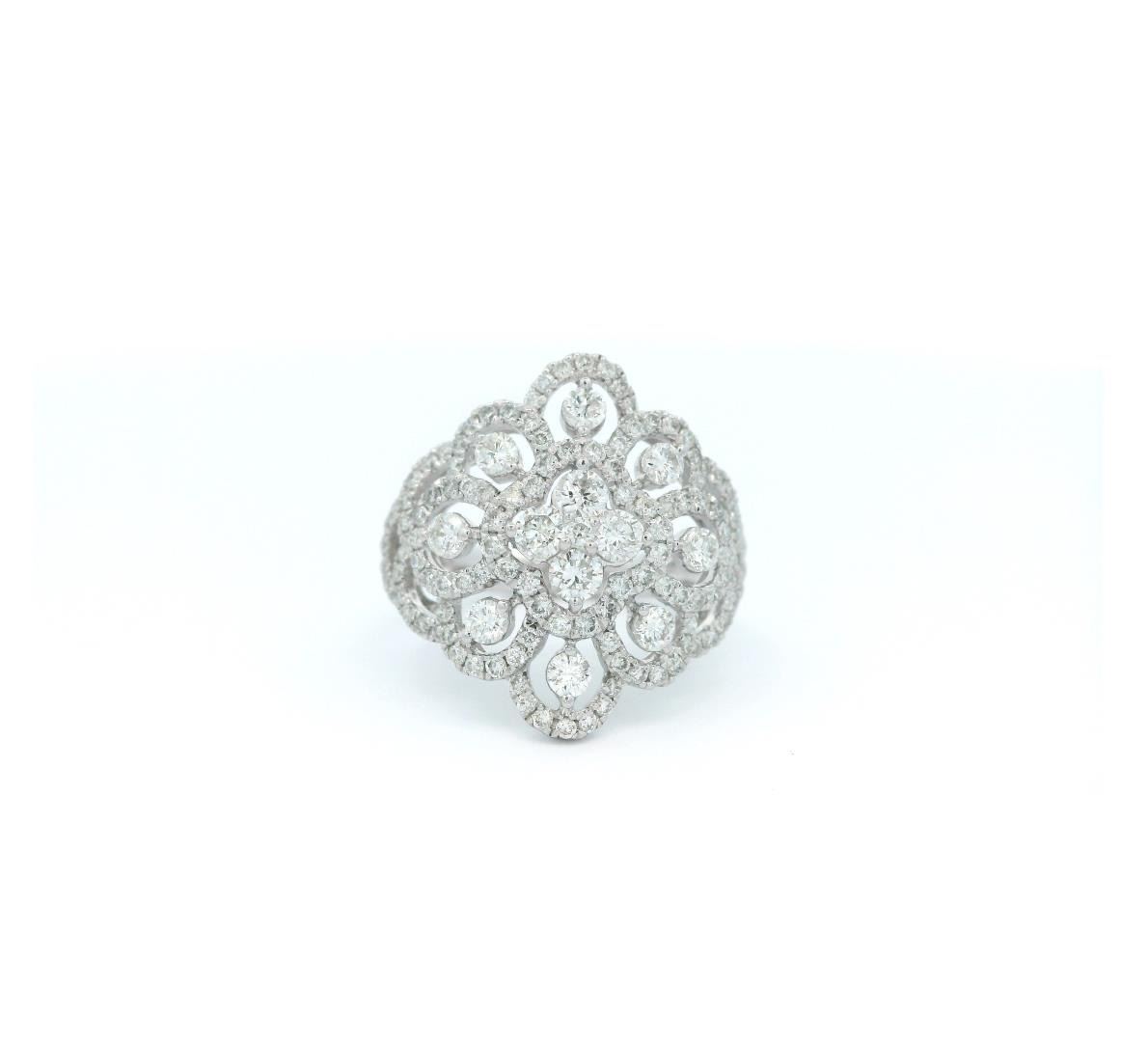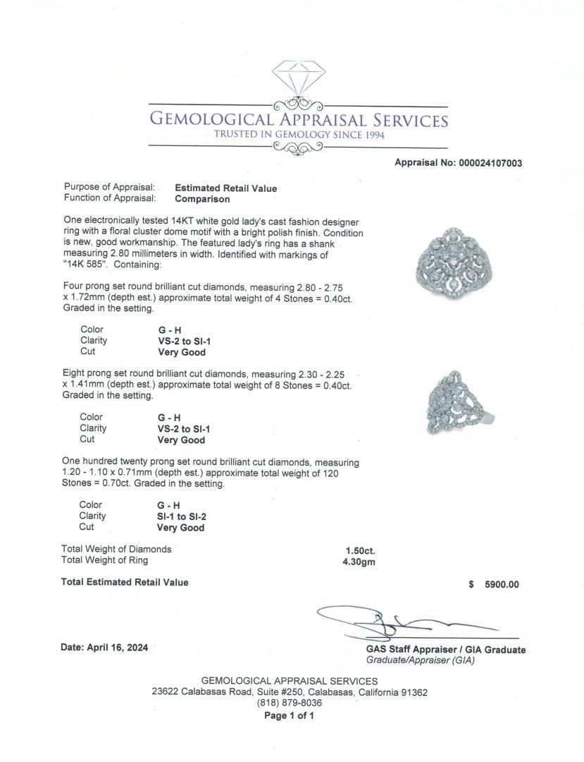 Crafted in 14kt white gold, this fashion designer ring features a floral cluster dome motif with a bright polish finish and a 2.80mm shank width. It is adorned with 132 prong-set round brilliant-cut diamonds, totaling 1.50ct, with G-H color and clarity ranging from VS-2 to SI-2, all graded Very Good cut. The intricate design showcases four larger diamonds (0.40ct total), eight medium diamonds (0.40ct total), and 120 smaller diamonds (0.70ct total) for a dazzling display of brilliance. This elegant statement piece is expertly crafted for a refined and luxurious look.
