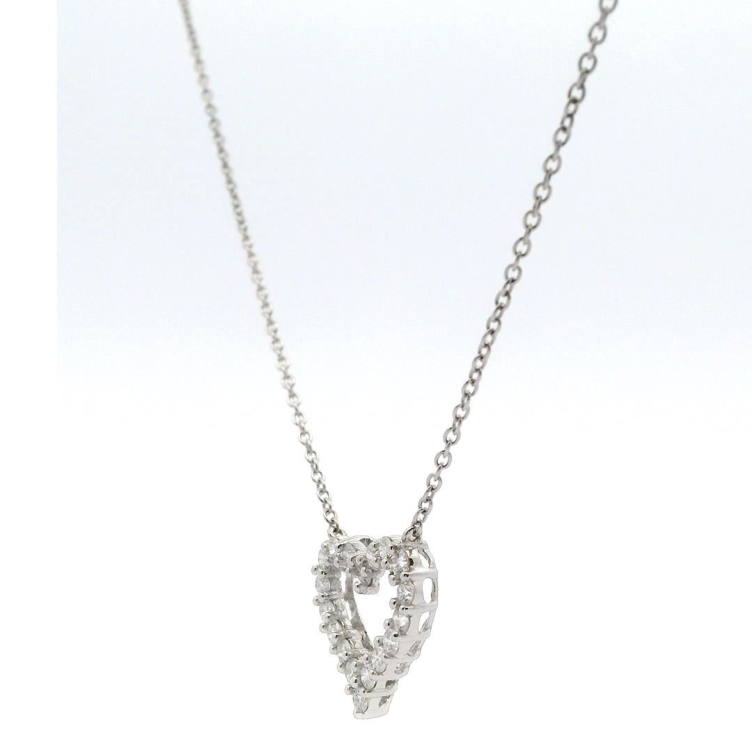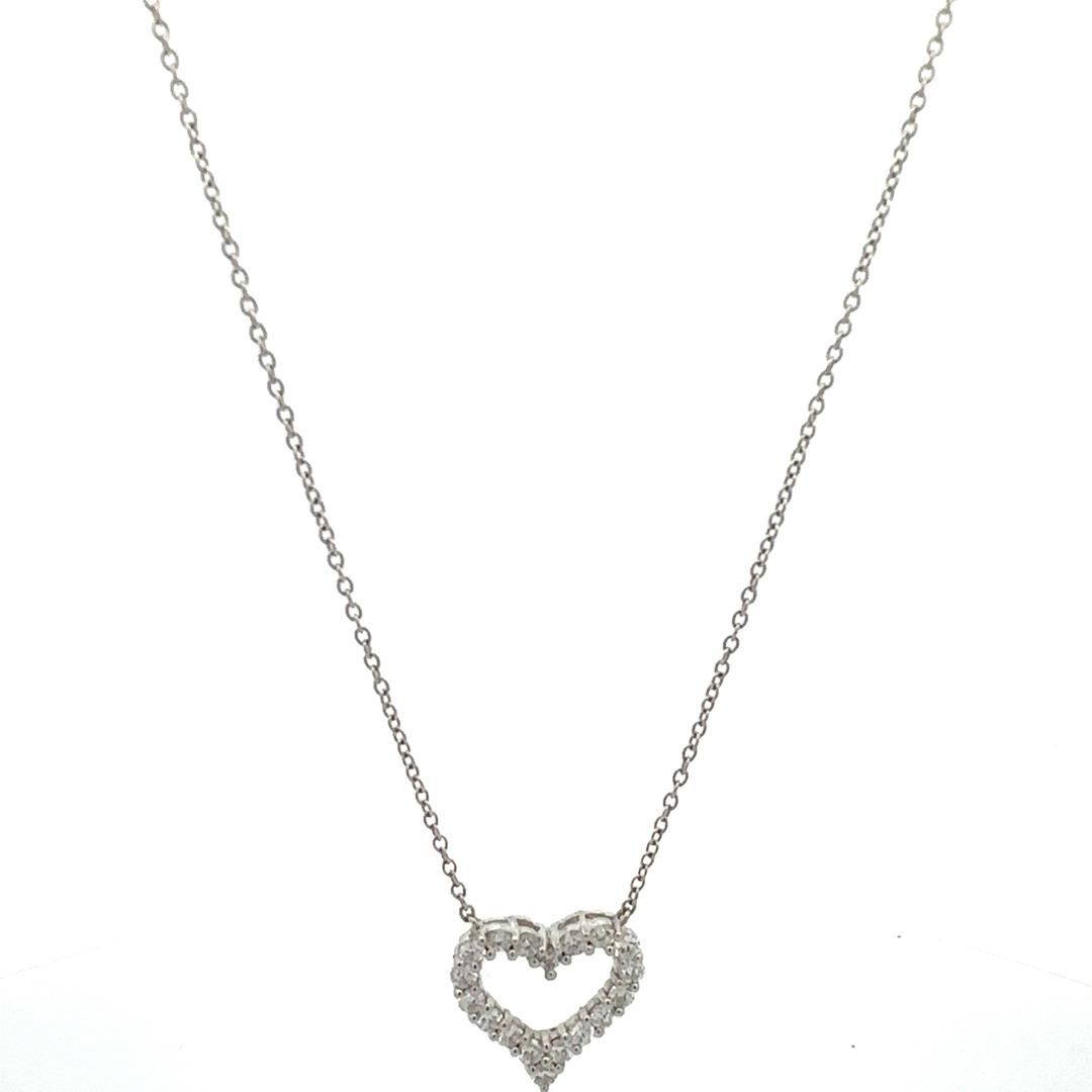 Designed in 14KT white gold, this open heart pendant necklace features eighteen prong-set round brilliant-cut diamonds totaling 0.70ct. Each diamond is graded G-H in color with VS-1 to SI-1 clarity, enhancing the pendant's radiant allure. The piece is suspended on a 16.5-inch oval cable link chain secured with a lobster claw clasp.