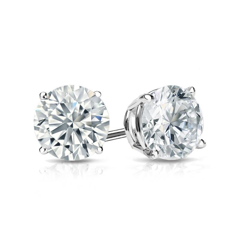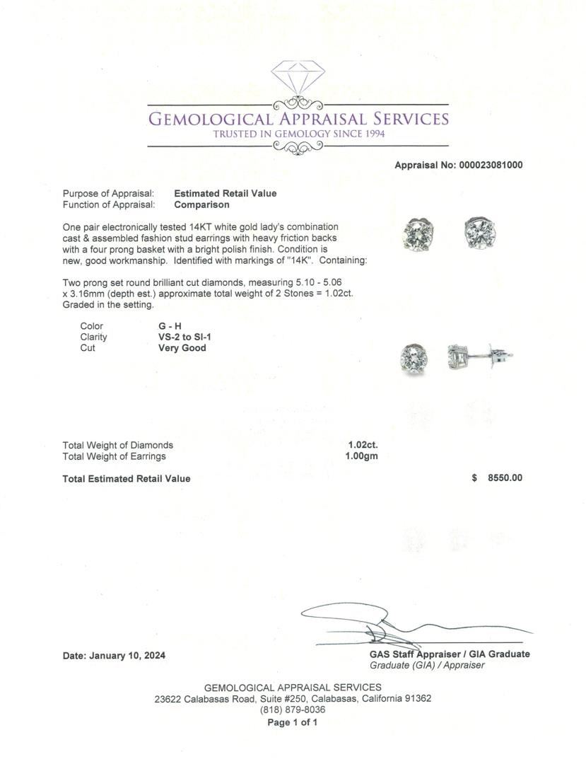 Crafted in 14kt white gold, this pair of fashion stud earrings features two prong-set round brilliant-cut diamonds with a total weight of approximately 1.02ct, measuring 5.10 - 5.06mm x 3.16mm (depth est.). The diamonds are graded G-H in color, VS-2 to SI-1 in clarity, and have a Very Good cut, ensuring exceptional brilliance. Set in a four-prong basket with a bright polish finish, these earrings are secured with heavy friction backs for durability and comfort. Appraised at $8,550, they are a timeless and sophisticated addition to any collection.
