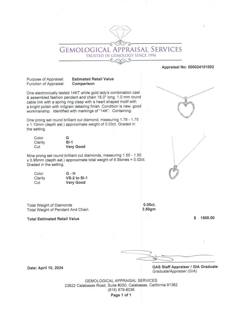 This 14KT white gold heart pendant necklace features a combination of ten round brilliant-cut diamonds, totaling 0.05ct, set within a milgrain-detailed heart motif. The pendant is suspended from an 18-inch round cable link chain, designed with a spring ring clasp for secure and comfortable wear.