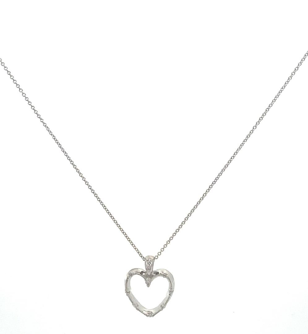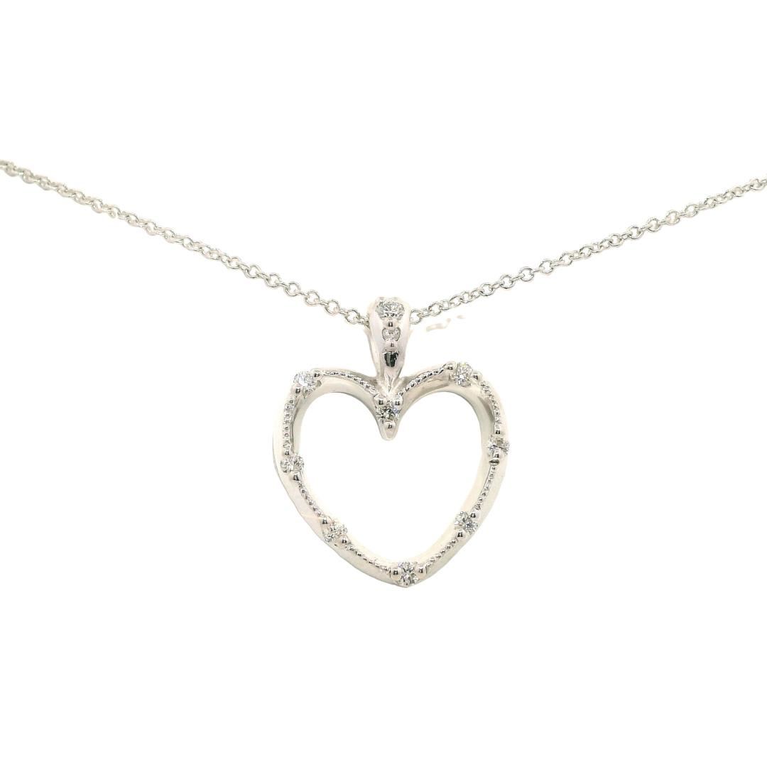 This 14KT white gold heart pendant necklace features a combination of ten round brilliant-cut diamonds, totaling 0.05ct, set within a milgrain-detailed heart motif. The pendant is suspended from an 18-inch round cable link chain, designed with a spring ring clasp for secure and comfortable wear.