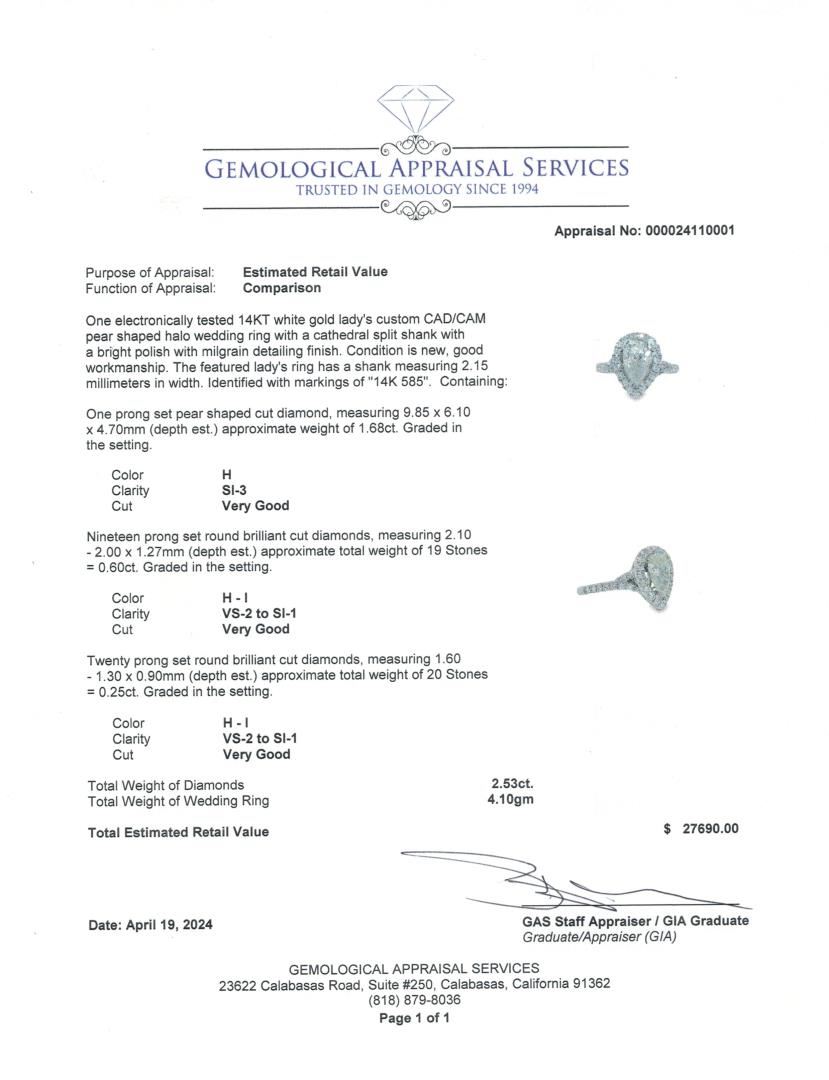 This custom CAD/CAM-designed 14KT white gold wedding ring features a pear-shaped diamond centerpiece weighing 1.68ct. It is complemented by nineteen round brilliant cut diamonds totaling 0.60ct and twenty additional round diamonds totaling 0.25ct. The diamonds range from H-I color, with SI-1 to VS-2 clarity and very good cut quality. The ring weighs 4.10 grams.