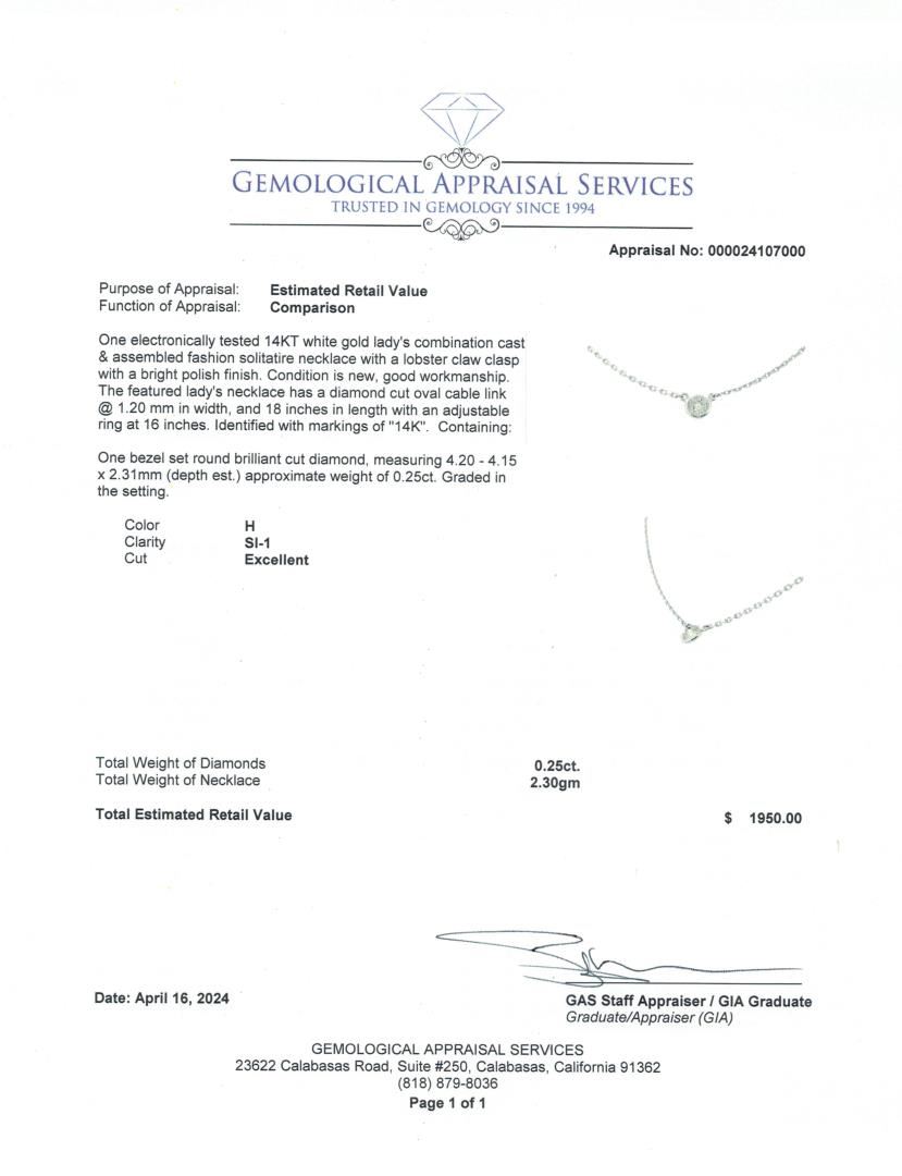 A timeless statement of simplicity, this 14kt white gold solitaire necklace features a 0.25ct bezel-set round brilliant-cut diamond, graded H in color, SI-1 in clarity, and Excellent cut. Suspended from an 18-inch diamond-cut oval cable link chain with an adjustable 16-inch length, this elegant pendant is secured with a lobster claw clasp. The understated design and bright polish finish make it a versatile addition to any collection.