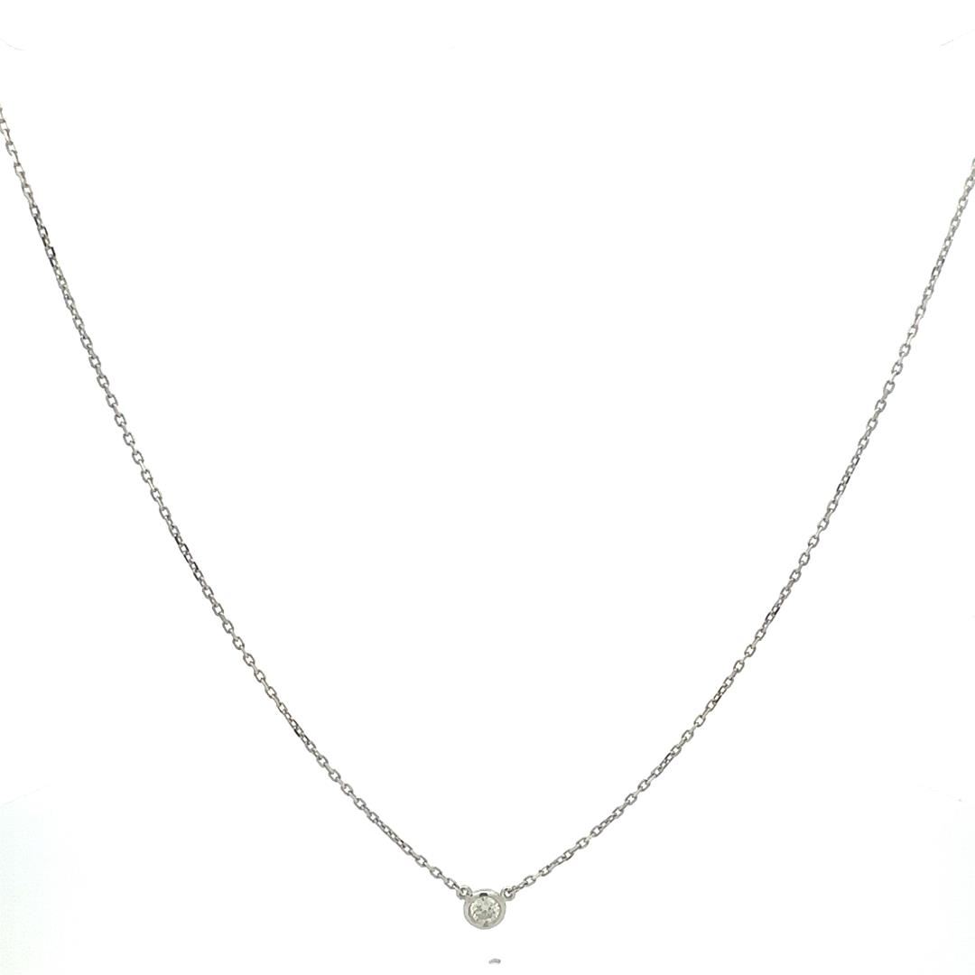 A timeless statement of simplicity, this 14kt white gold solitaire necklace features a 0.25ct bezel-set round brilliant-cut diamond, graded H in color, SI-1 in clarity, and Excellent cut. Suspended from an 18-inch diamond-cut oval cable link chain with an adjustable 16-inch length, this elegant pendant is secured with a lobster claw clasp. The understated design and bright polish finish make it a versatile addition to any collection.