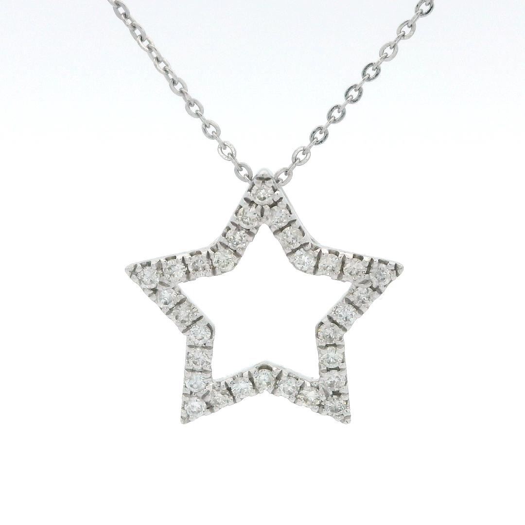 This 14KT white gold necklace features a charming star-shaped pendant adorned with thirty round brilliant-cut diamonds totaling 0.22ct. The diamonds are graded H-I in color and SI-1 to SI-2 in clarity, adding a celestial sparkle. The piece is completed with an adjustable 18-inch chain for versatile wear.