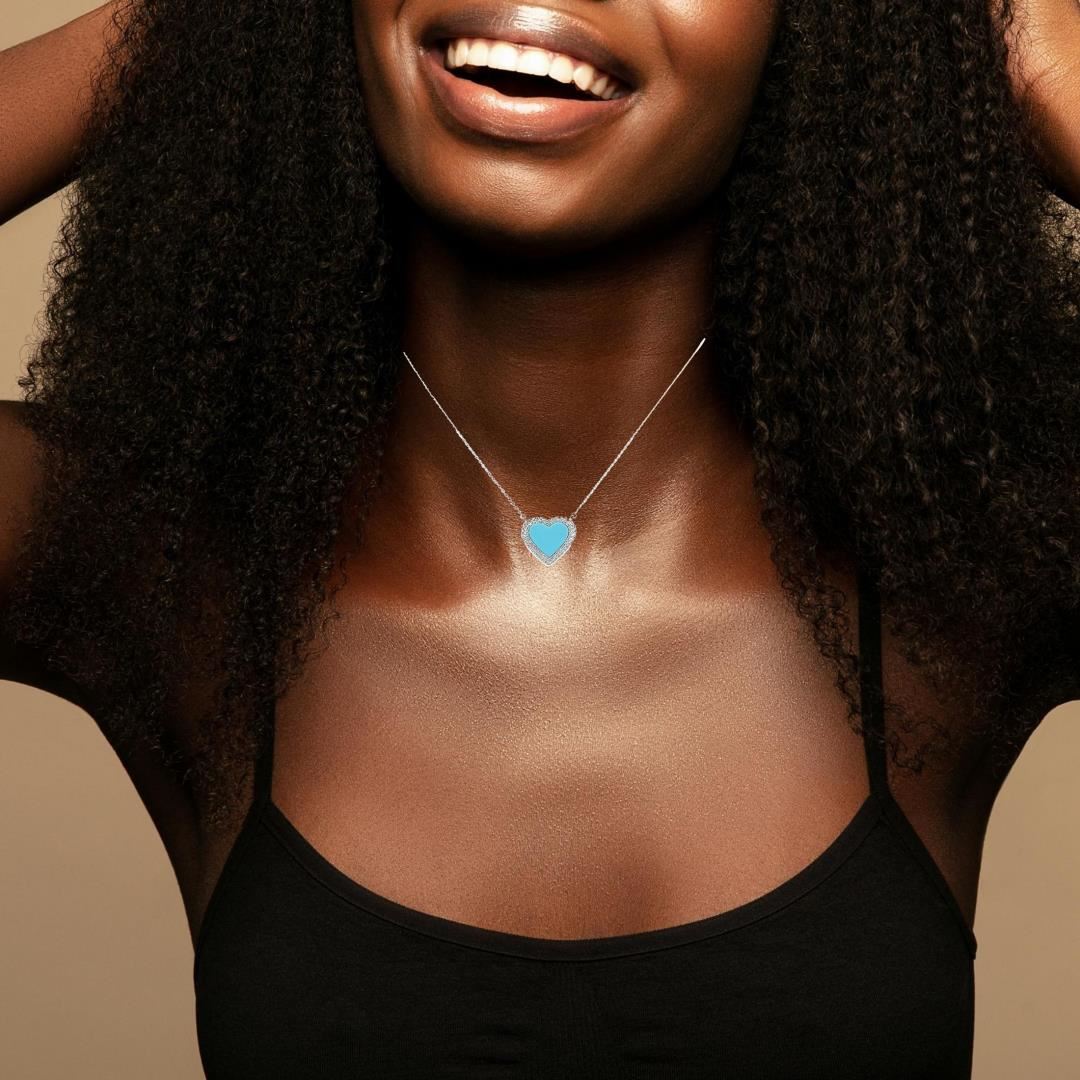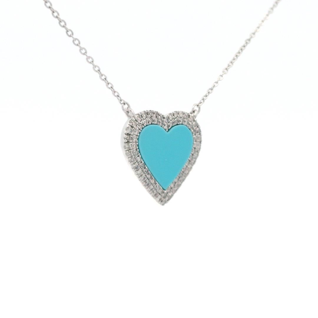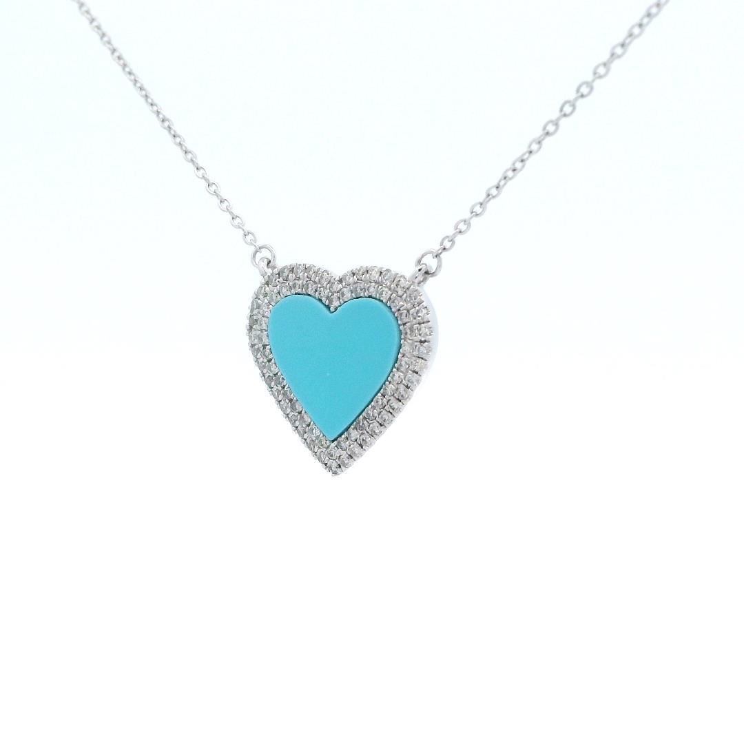 This enchanting 14kt white gold necklace features a heart-shaped turquoise pendant, embraced by a halo of 72 prong-set round brilliant-cut diamonds totaling 0.15ct. Each diamond is graded G-H color, VS to SI-2 clarity, and Very Good cut, offering a delicate shimmer against the vibrant turquoise. The 18-inch oval cable link chain, secured with a lobster claw clasp, includes adjustment rings at 16 and 17 inches, allowing for versatile wear. A perfect blend of elegance and charm, this piece makes a striking statement.