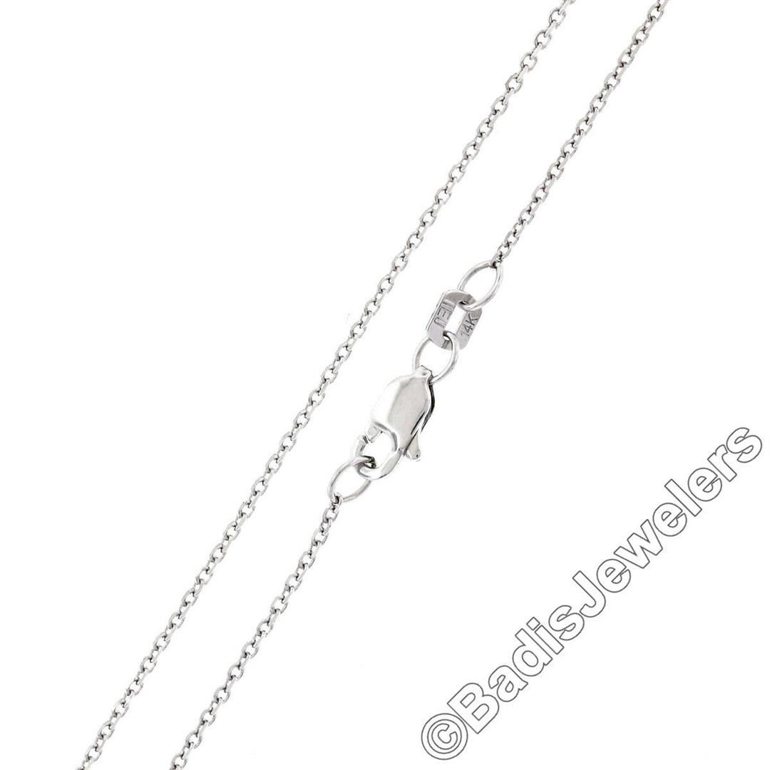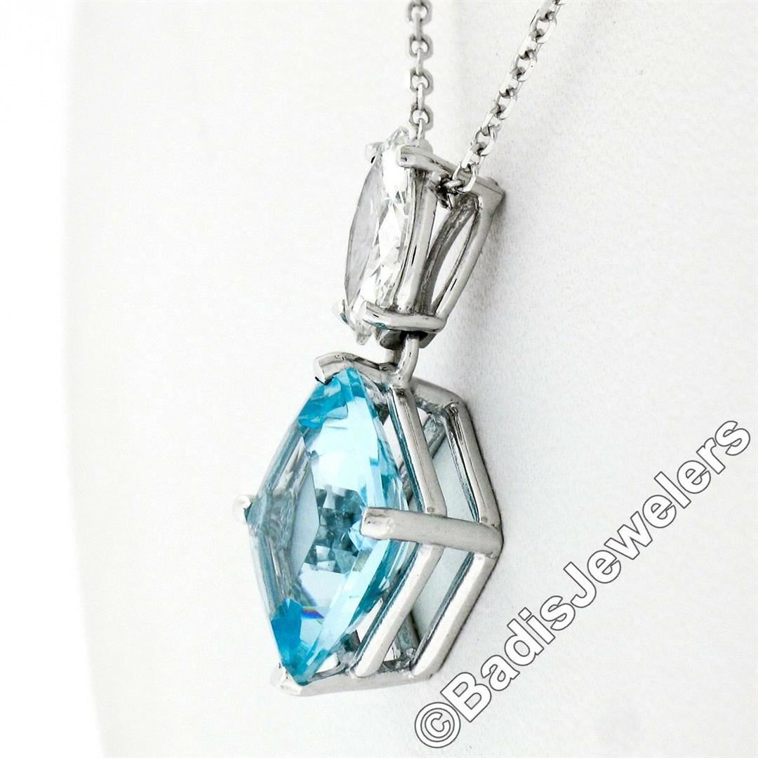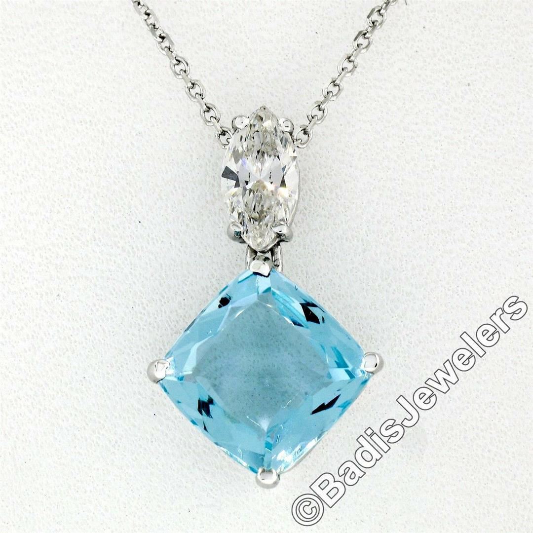 A 14kt white gold dangle pendant necklace featuring a square cushion cut aquamarine (10.0x10.0mm / 3.48ct) and a marquise cut diamond (G - VS2; 0.64ct). 18 inch cable link chain, 3.77 grams total weight, pendant measures 22.25x13.65mm.