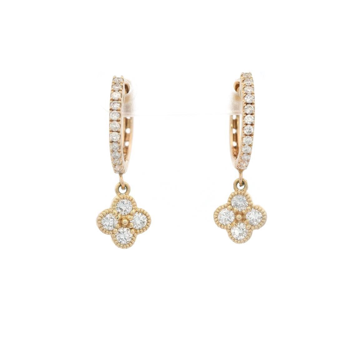 Designed with intricate detail, these 14kt yellow gold clover motif earrings feature hinged snap-locking posts and a delicate dangle motif accentuated by a milgrain detailing finish. Each earring is adorned with eight prong-set round brilliant-cut diamonds (0.48ct total) and 24 smaller prong-set round brilliant-cut diamonds (0.30ct total), all graded G-H color, VS-1 to SI-1 clarity, and Very Good cut. The combination of a bright polish finish and vintage-inspired craftsmanship makes these earrings a charming and timeless accessory.
