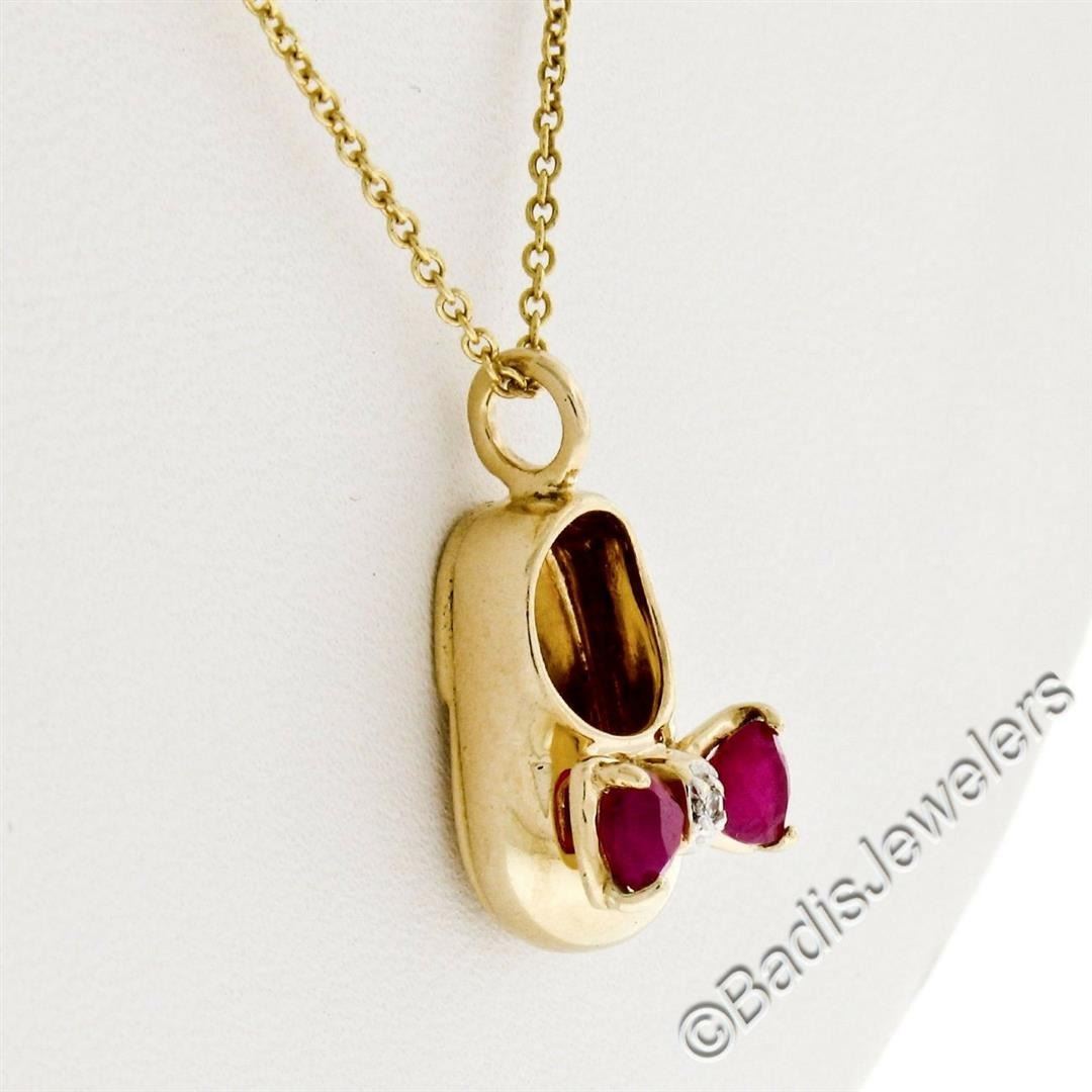 A 14kt yellow gold baby shoe pendant with 0.32ctw of trillion cut rubies and a 1pt round diamond (F - SI1). 16 inch fine cable link chain, 4.34 grams total weight, measures 19.95x10.60mm.