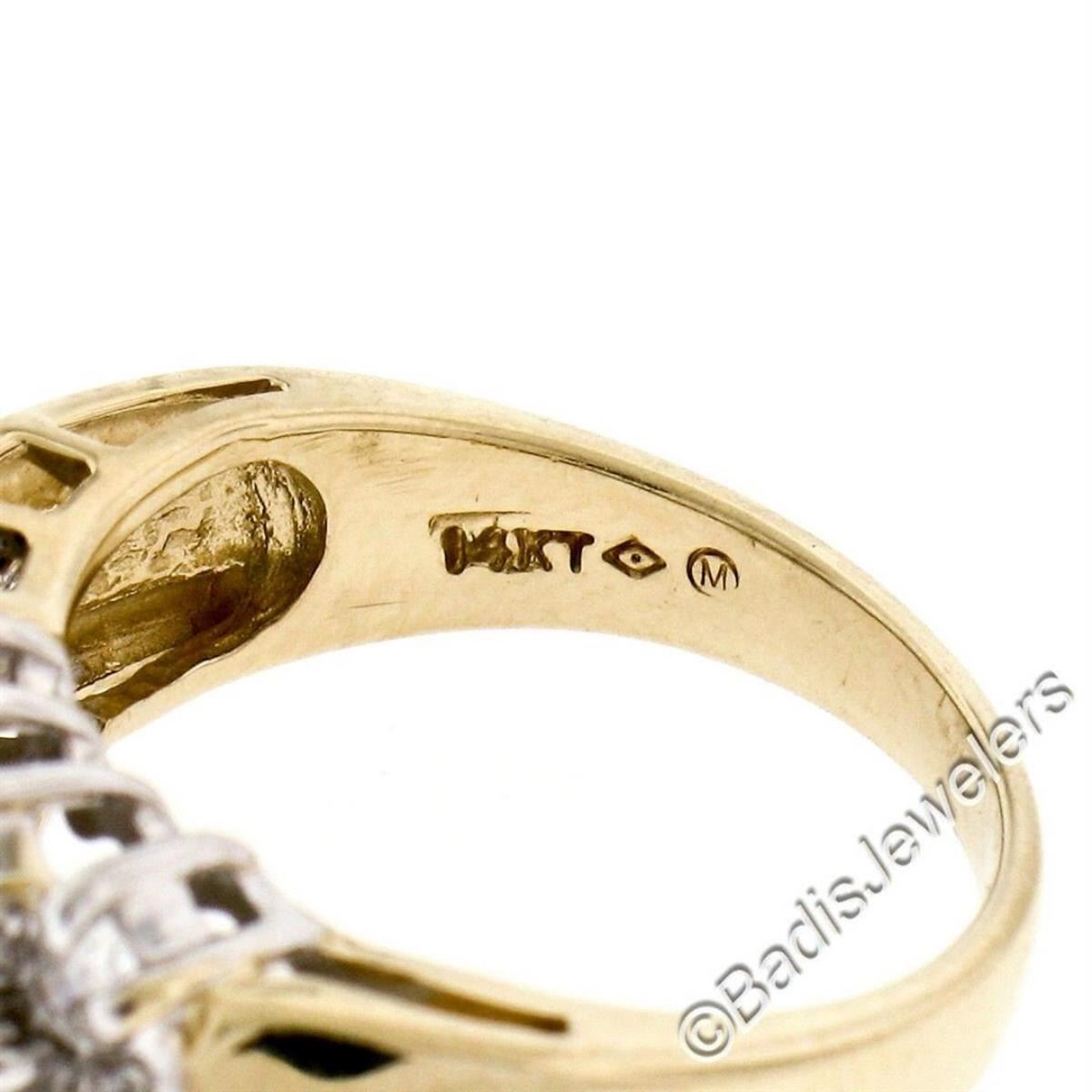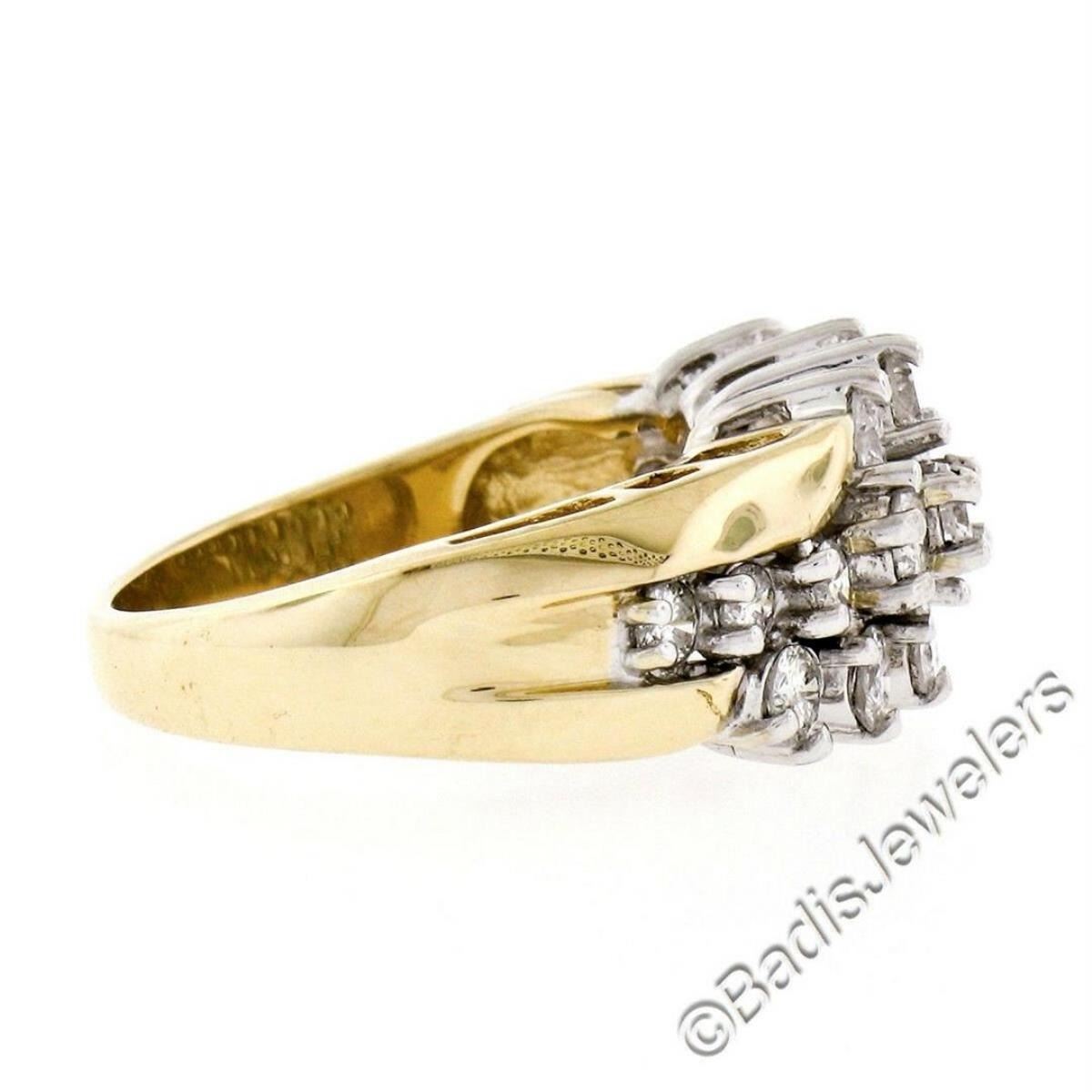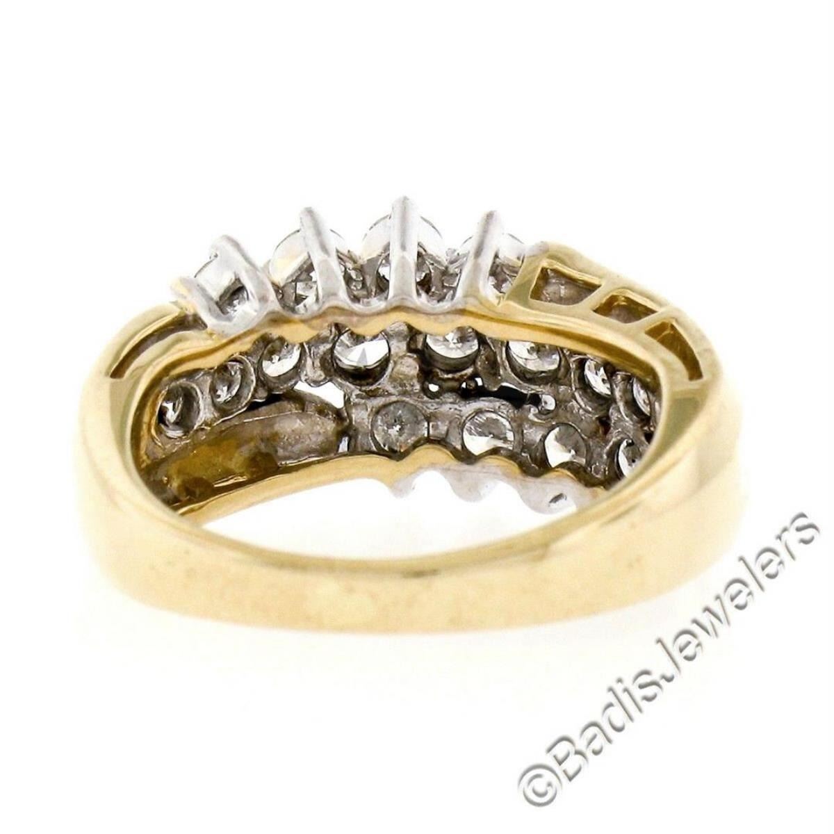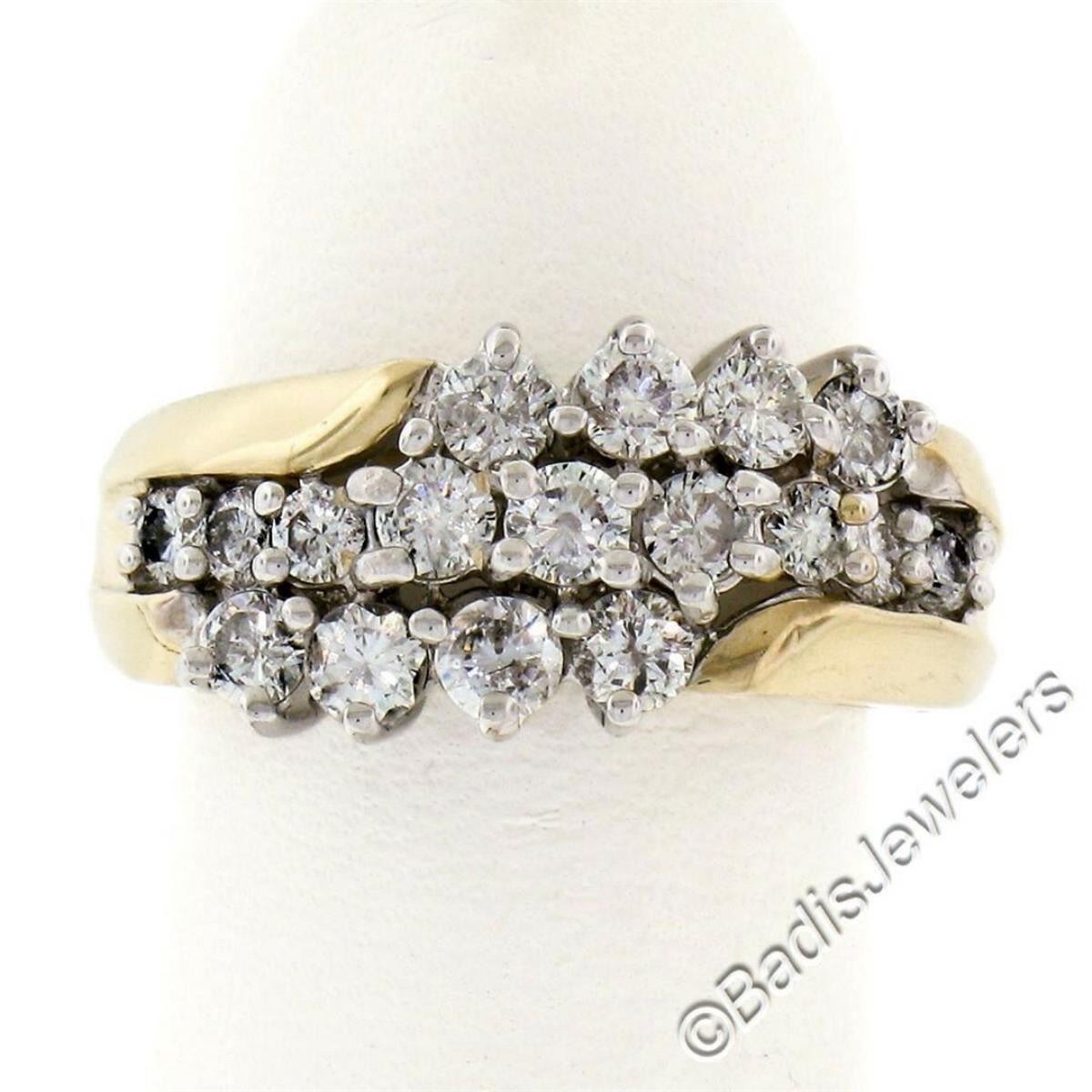 A 14kt yellow gold band ring featuring 17 round brilliant diamonds (G/H - VS2/SI1; 1.10ctw) prong set in three rows. The ring is size 5, weighs a total of 5.44 grams, and measures 9.2mm wide.