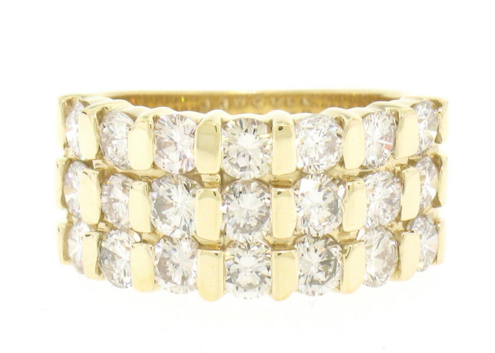 A brand new 14kt yellow gold band ring bar set with 2.52ctw of round diamonds (F - VS2). The ring is size 5, weighs a total of 8.6 grams, and measures 10.2mm wide.