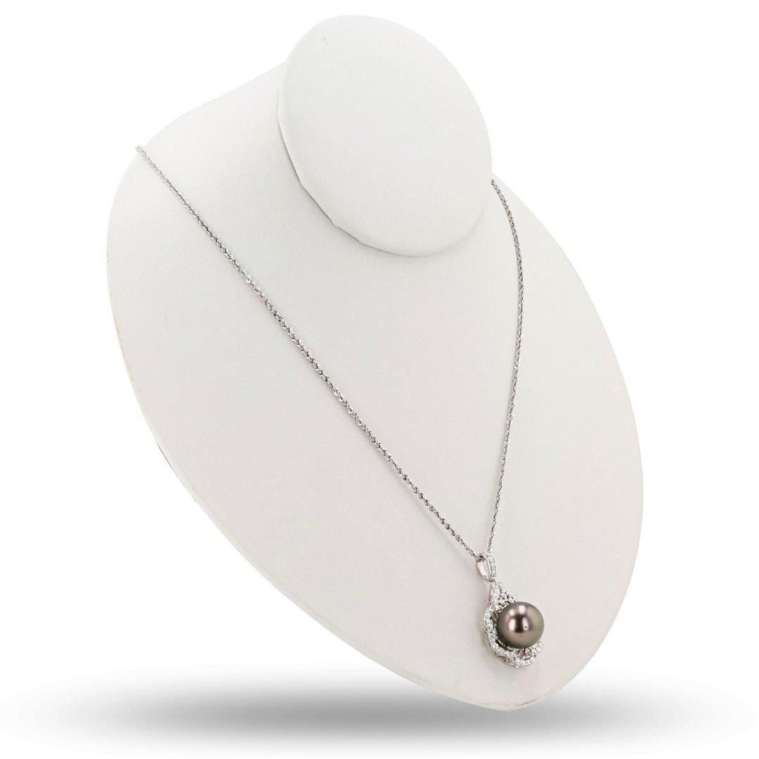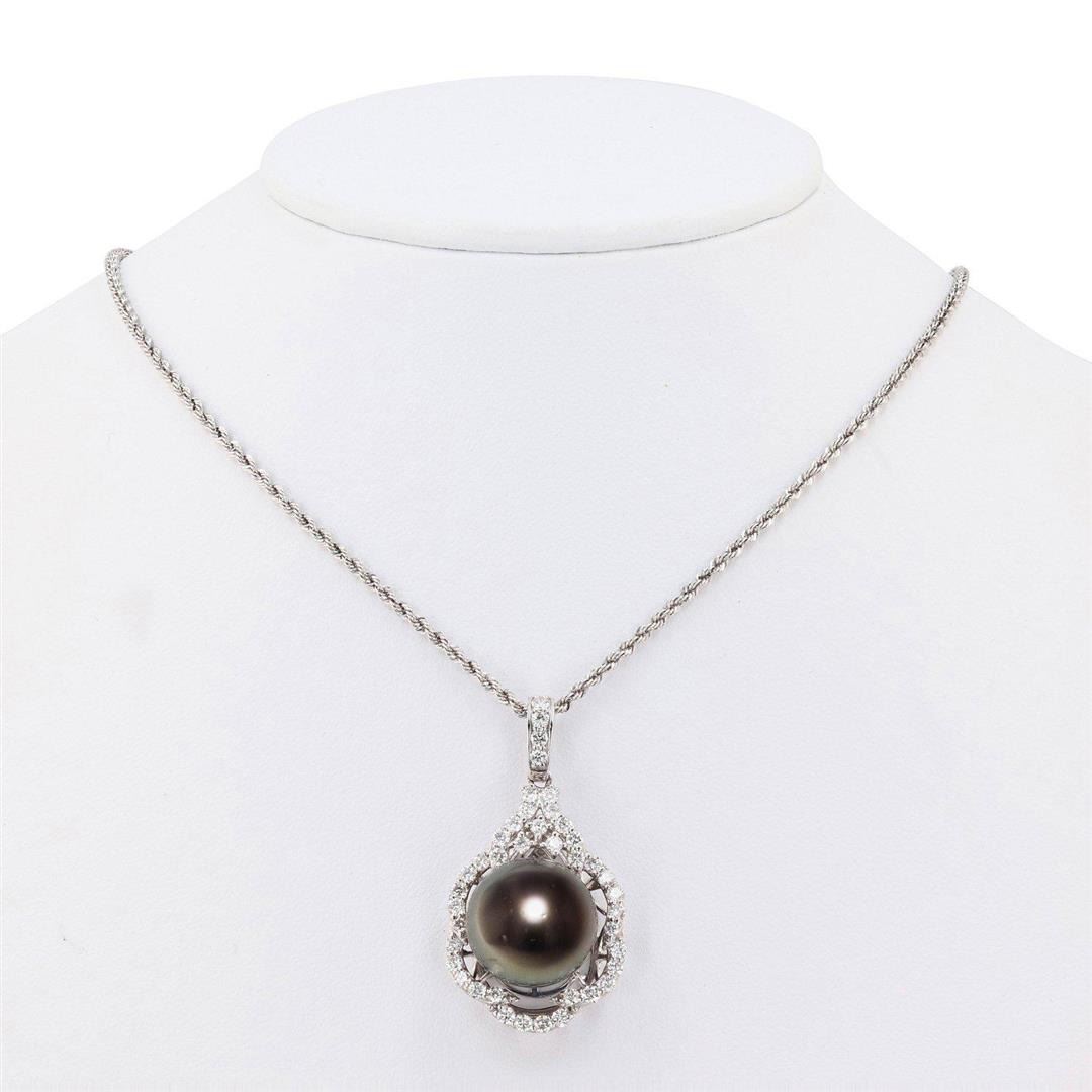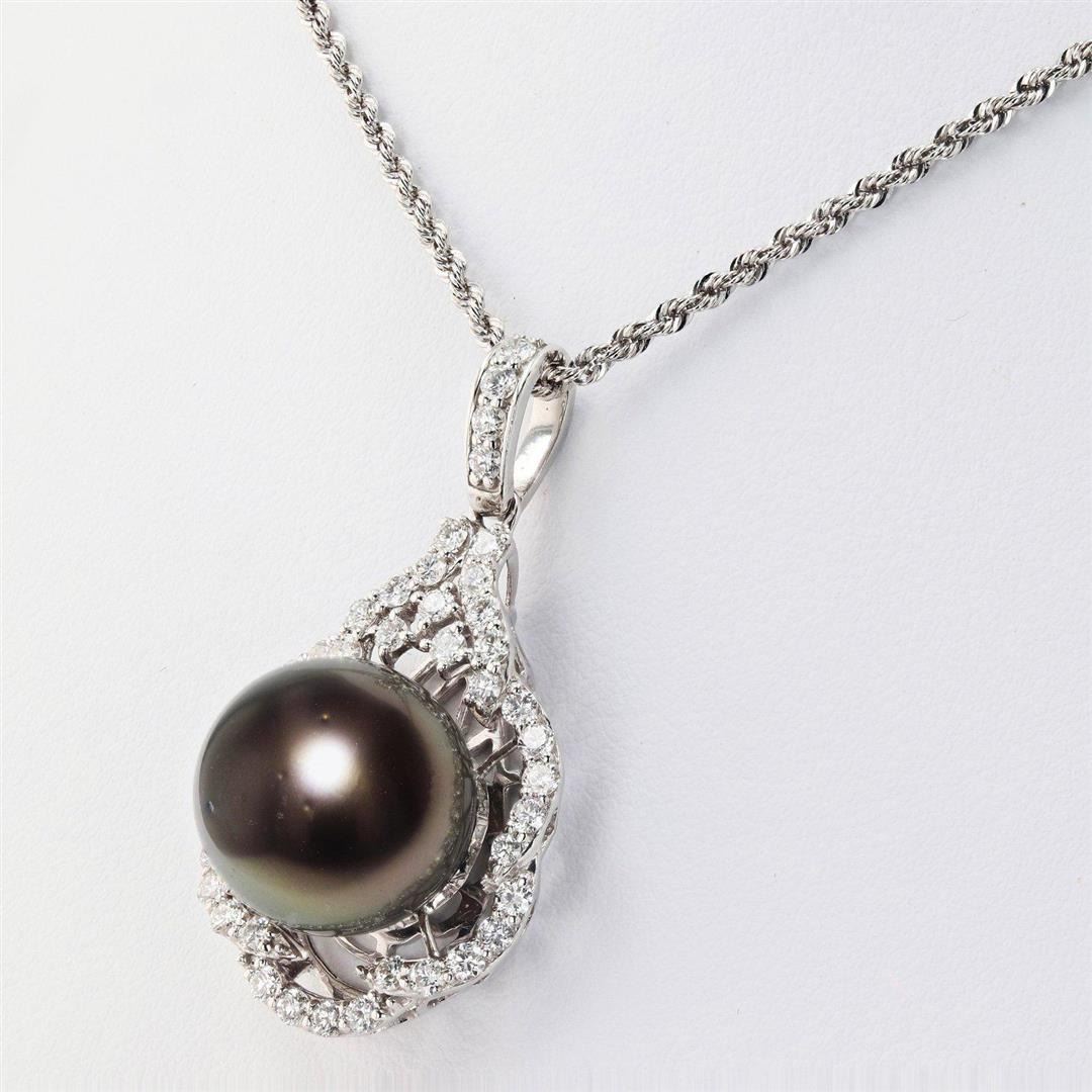 One polished, stamped, and tested platinum pendant mounted with: I genuine cultured Tahitian Pearl, and 41 genuine round diamonds weighing approximately 0.99 carats. The pendant hangs from a platinum rope chain measuring 18 inches in length. This item wei