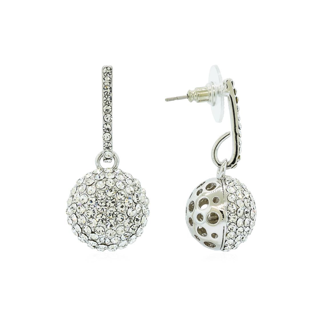 High end designer jewelry. 14mm Crystal Pave Bead Earrings - Silver Plated. Silver Plated Post Set. Silver/ Clear. 1"Dangle.