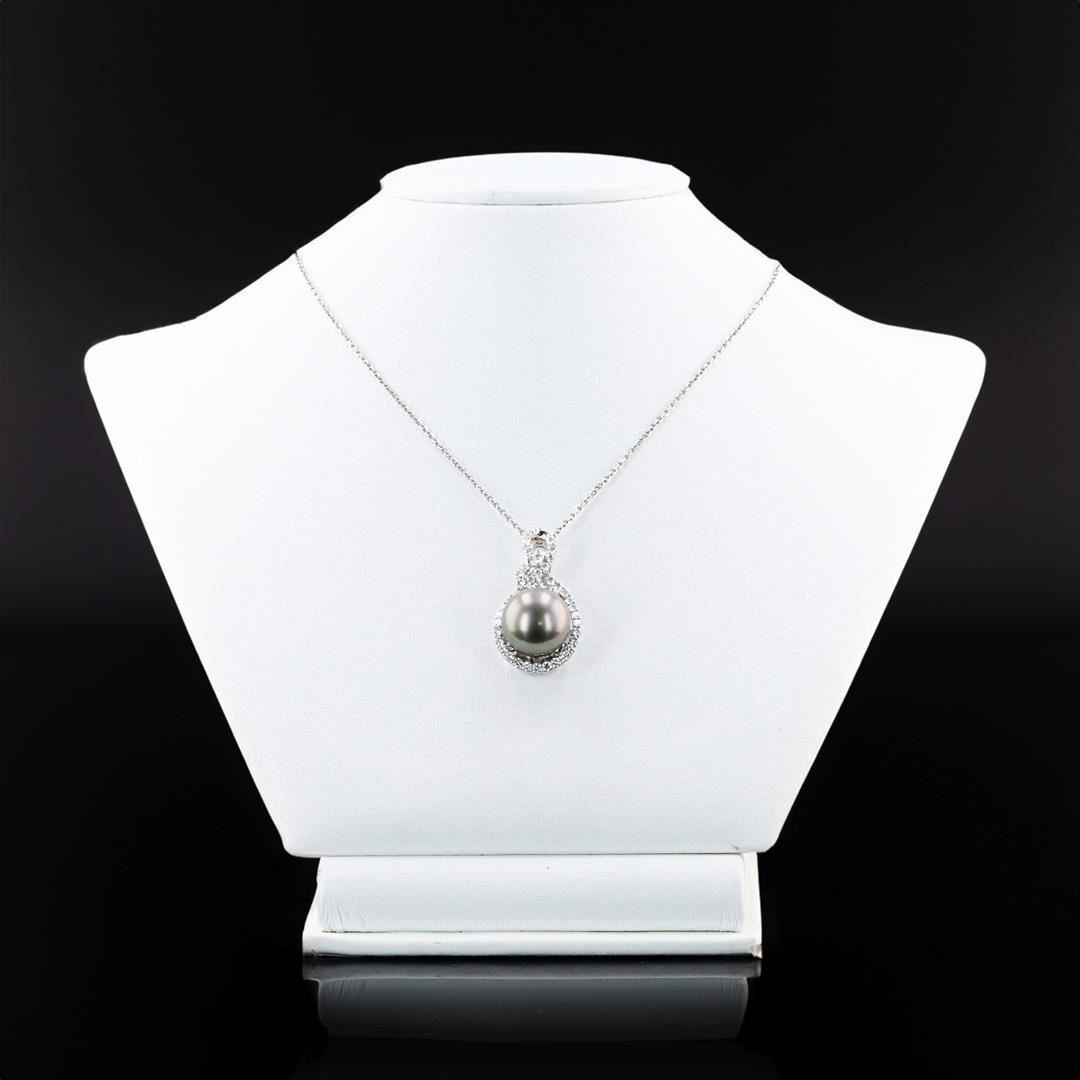 One polished, stamped, and tested platinum pendant mounted with: 1 genuine cultured Tahitian Pearl, and 41 genuine round diamonds weighing approximately 1.07 carats. The pendant hangs from a platinum link chain measuring 20 inches in length. This item wei