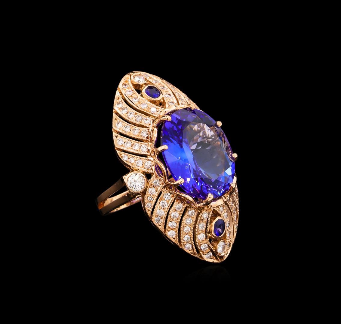 One electronically tested 14KT rose gold lady's cast fashion ring with a basket halo with a bright polish with milgrain detailing finish. The featured lady's ring has a shank measuring 2.88 millimeters wide. Identified with markings of "14K". Condition is new, good workmanship. Containing: One prong set oval modified brilliant cut natural tanzanite, measuring 18.20 x 16.19 x 7.25mm, approximate weight of 15.02ct., clarity is eye clean, type I, medium dark, moderately strong, violetish blue color, (GIA vB 6/4), cut is excellent. Transmitting light with no distortion, transparent. Colored gemstones are presumed to have been subjected to commonly used enhancement processes. Graded in the setting. Two bezel set round modified brilliant cut natural blue sapphires, measuring 3.20 - 3.10 x 2.05 mm, 5%. bulge factor, approximate total weight of 0.37ct., clarity is eye clean, type II, medium dark, strong, violetish blue color, (GIA vB 6/5), cut is very good. Transmitting light with no distortion, transparent. Colored gemstones are presumed to have been subjected to commonly used enhancement processes. Graded in the setting. Two bezel set round brilliant cut diamonds, measuring 3.60 - 3.50 x 2.20mm (depth est.) approximate total weight of 2 Stones = 0.35ct. Graded in the setting. Clarity: SI-1 to SI-2. Color: H - I. Cut Very Good Two prong set round brilliant cut diamonds, measuring 2.40 - 2.35 x 1.45mm (depth est.) approximate total weight of 2 Stones = 0.10ct. Graded in the setting. Clarity: SI-1 to I-1. Color: G - Very Good Eighty prong set round brilliant cut diamonds, measuring 1.55 - 1.45 x 0.93mm (depth est.) approximate total weight of 80 Stones = 1.02ct. Graded in the setting. Clarity: SI-1 to I-1. Color: G - I. Cut Good Eight prong set round brilliant cut diamonds, measuring 1.30 - 1.20 x 0.78mm (depth est.) approximate total weight of 8 Stones = 0.06ct. Graded in the setting. Clarity: SI-1 to I-1. Color: H - I. Cut Good. Total Weight of Colored Stones 15.39ct. Total Weight of Diamonds 1.53ct. Total Weight of Ring 17.40gm. GAS Appraised at $34,415.00.