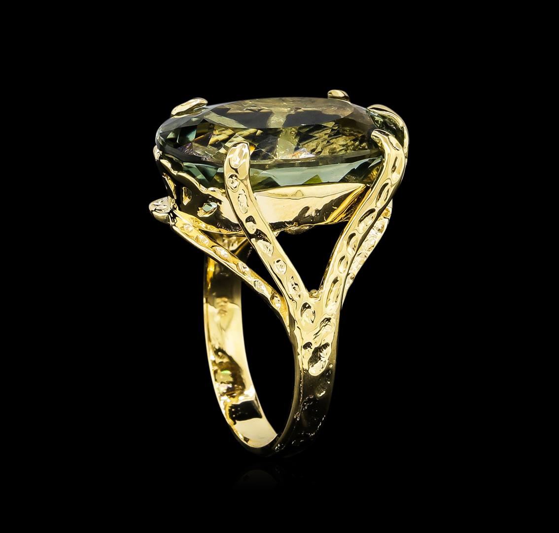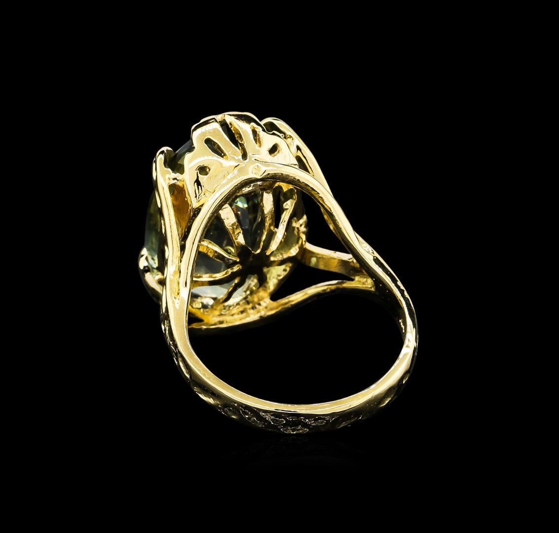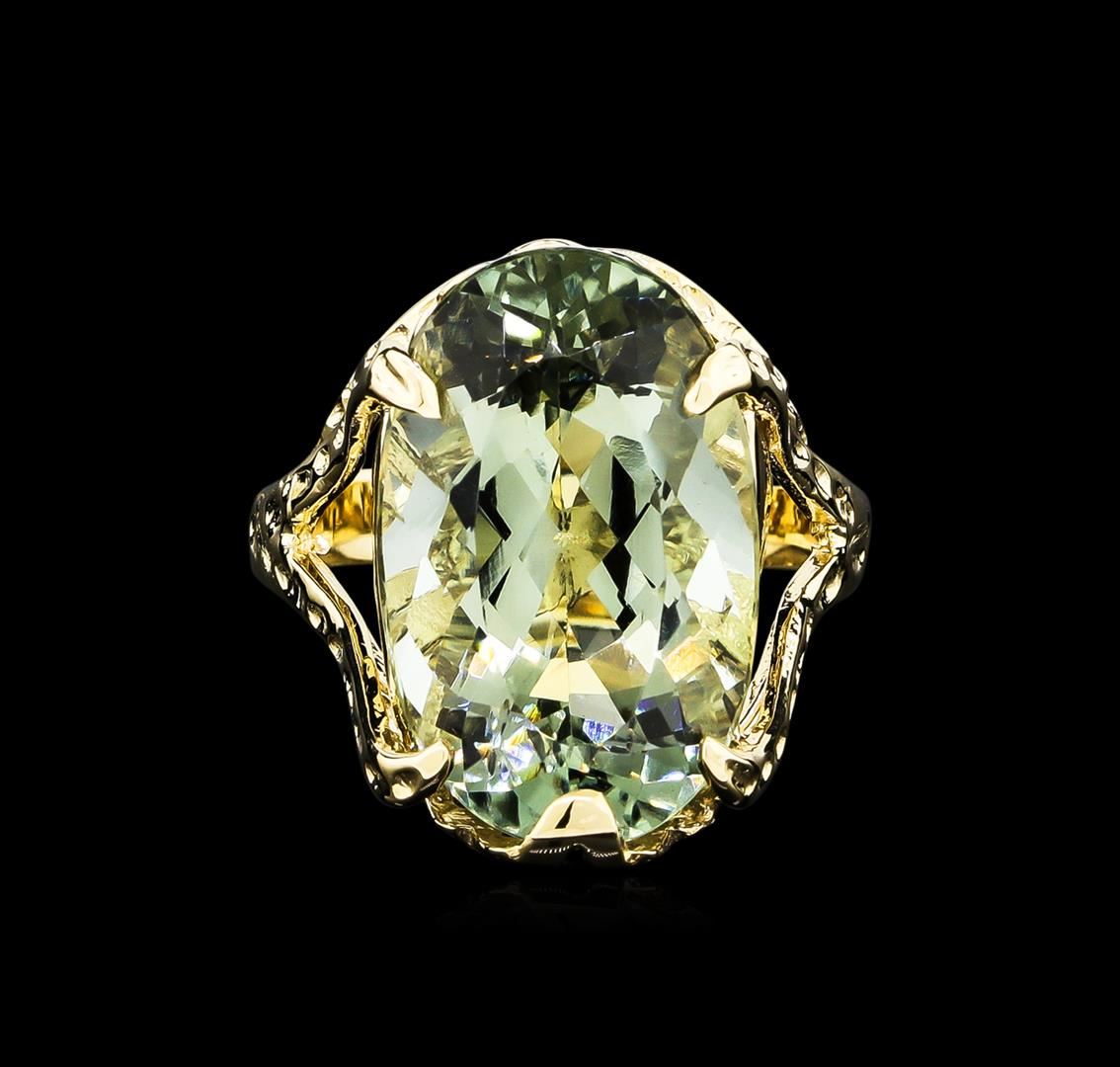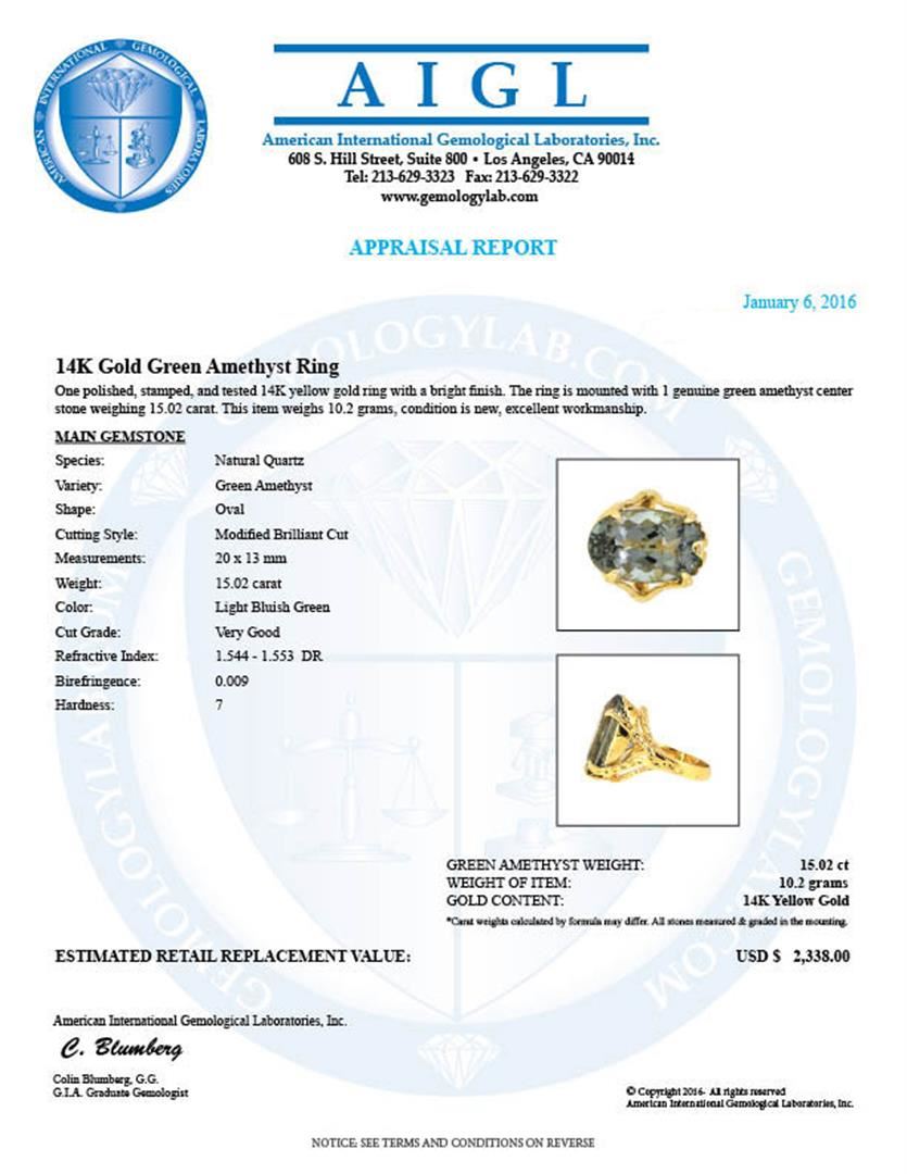 One polished, stamped, and tested 14KT yellow gold ring with a bright finish. The ring is mounted with 1 genuine green amethyst center stone weighing 15.02ct. This item weighs 10.20 grams, condition is new, excellent workmanship. MAIN GEMSTONE: Species: Natural Quartz. Variety: Green Amethyst. Shape: Oval. Cutting Style: Modified brilliant cut. Measurements: 20 x 13mm. Weight: 15.02ct. Color: Light bluish green. Cut Grade: Very good. Refractive Index: 1.544 - 1.553 DR. Birefringence: 0.009. Hardness: 7. AIGL Appraised at $2,338.00.
