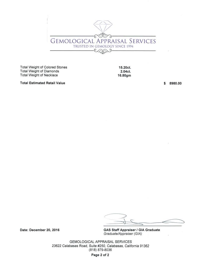 One electronically tested 18KT white gold lady's combination cast & assembled dangling fringe necklace with a spring ring clasp with a bright polish finish. The featured lady's necklace has a 1.4mm thick round cable link chain measuring approximately fifteen inches long, containing eighteen diamond bezel links. Identified with markings of '18K 750'. Condition is new, good workmanship. Containing: One prong set rectangular cushion modified brilliant cut natural kunzite, measuring 17.96 x 12.70 x 8.90mm, (depth est.) approximate weight of 15.20ct., clarity is eye clean, light, very slightly grayish, purple red color, (GIA PR 3/3), cut is very good. Transmitting light with no distortion, transparent. Colored gemstones are presumed to have been subjected to commonly used enhancement processes. Graded in the setting. Six bezel set round brilliant cut diamonds, measuring 2.70 - 2.60 x 1.64mm (depth est.) approximate total weight of 6 Stones = 0.42ct. Graded in the setting. Clarity SI-2 to I-1. Color: H - I Cut Good Sixty-Three bezel set round brilliant cut diamonds, measuring 1.70 - 1.60 x 1.02mm (depth est.) approximate total weight of 63 Stones = 1.06ct. Graded in the setting. Clarity SI-1 to I-1. Color: H - I Cut Good Forty-Nine prong set round brilliant cut diamonds, measuring 1.50 - 1.40 x 0.90mm (depth est.) approximate total weight of 49 Stones = 0.56ct. Graded in the setting. Clarity SI-2 to I-1. Color: H - I Cut Good. Total Weight of Colored Stones 15.20ct.. Total Weight of Diamonds 2.04ct.. Total Weight of Necklace 16.80gm. GAS Appraised at $8,980.00.