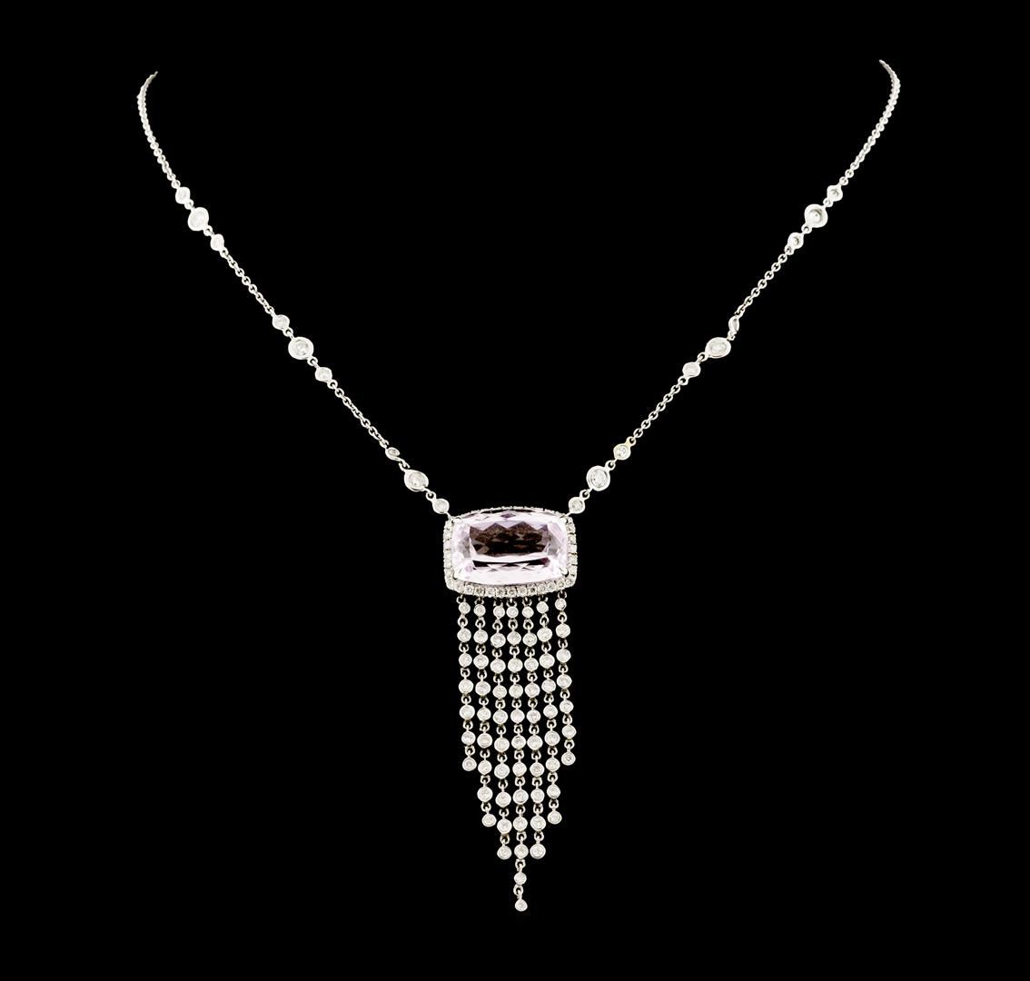 One electronically tested 18KT white gold lady's combination cast & assembled dangling fringe necklace with a spring ring clasp with a bright polish finish. The featured lady's necklace has a 1.4mm thick round cable link chain measuring approximately fifteen inches long, containing eighteen diamond bezel links. Identified with markings of '18K 750'. Condition is new, good workmanship. Containing: One prong set rectangular cushion modified brilliant cut natural kunzite, measuring 17.96 x 12.70 x 8.90mm, (depth est.) approximate weight of 15.20ct., clarity is eye clean, light, very slightly grayish, purple red color, (GIA PR 3/3), cut is very good. Transmitting light with no distortion, transparent. Colored gemstones are presumed to have been subjected to commonly used enhancement processes. Graded in the setting. Six bezel set round brilliant cut diamonds, measuring 2.70 - 2.60 x 1.64mm (depth est.) approximate total weight of 6 Stones = 0.42ct. Graded in the setting. Clarity SI-2 to I-1. Color: H - I Cut Good Sixty-Three bezel set round brilliant cut diamonds, measuring 1.70 - 1.60 x 1.02mm (depth est.) approximate total weight of 63 Stones = 1.06ct. Graded in the setting. Clarity SI-1 to I-1. Color: H - I Cut Good Forty-Nine prong set round brilliant cut diamonds, measuring 1.50 - 1.40 x 0.90mm (depth est.) approximate total weight of 49 Stones = 0.56ct. Graded in the setting. Clarity SI-2 to I-1. Color: H - I Cut Good. Total Weight of Colored Stones 15.20ct.. Total Weight of Diamonds 2.04ct.. Total Weight of Necklace 16.80gm. GAS Appraised at $8,980.00.