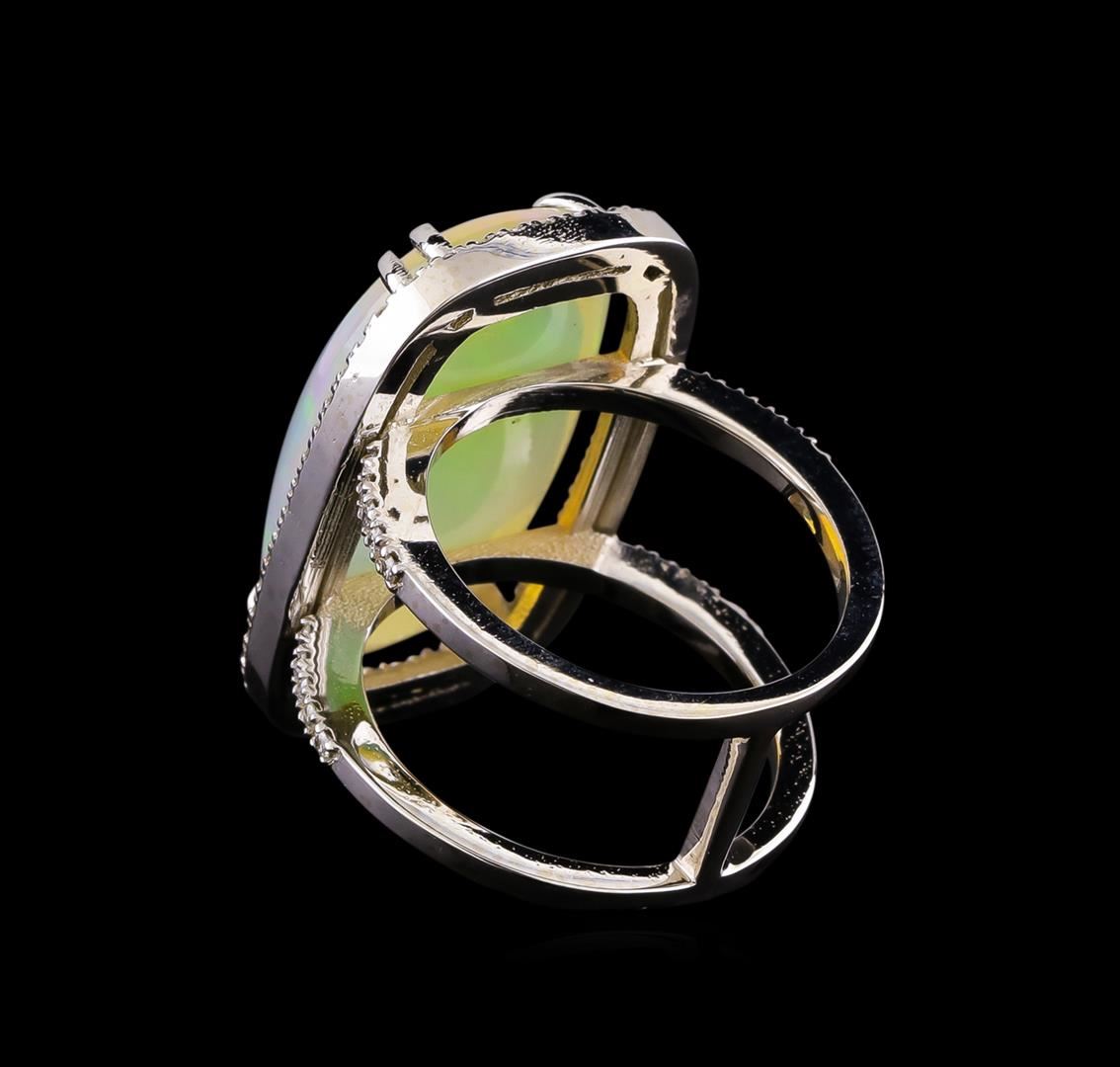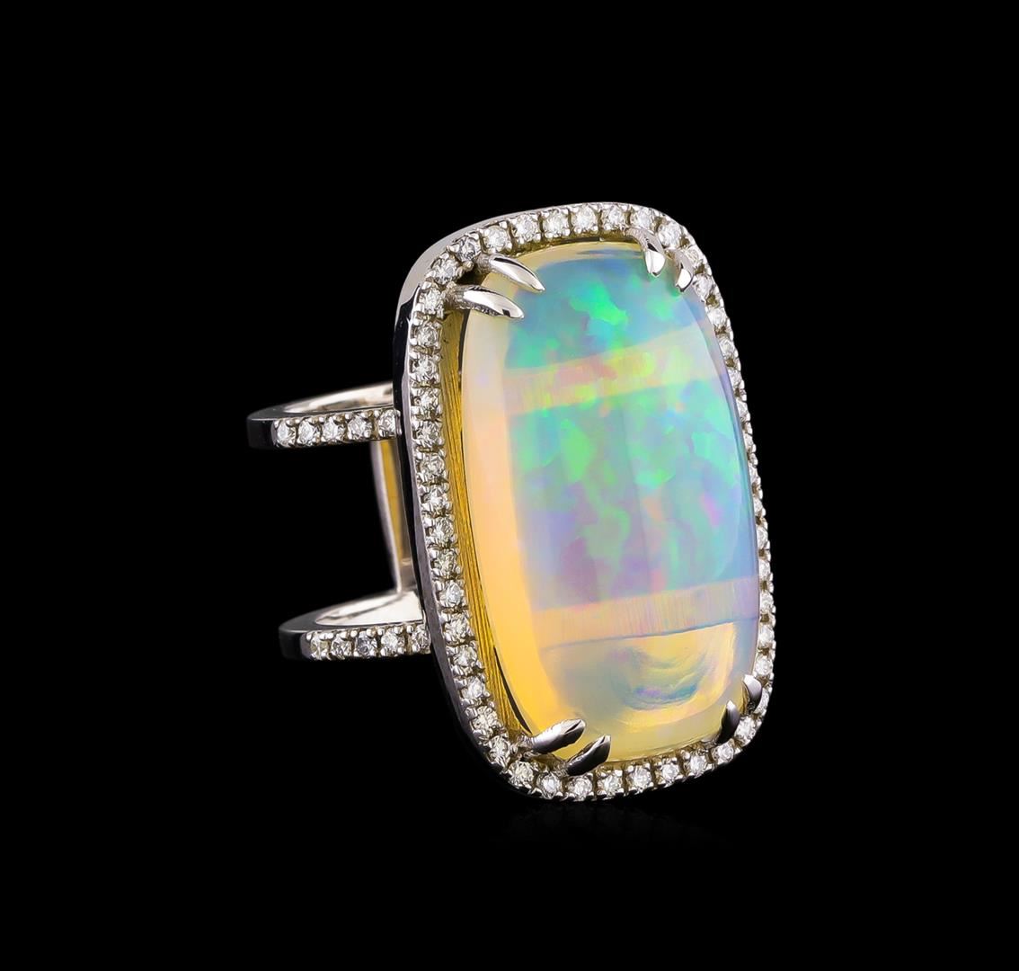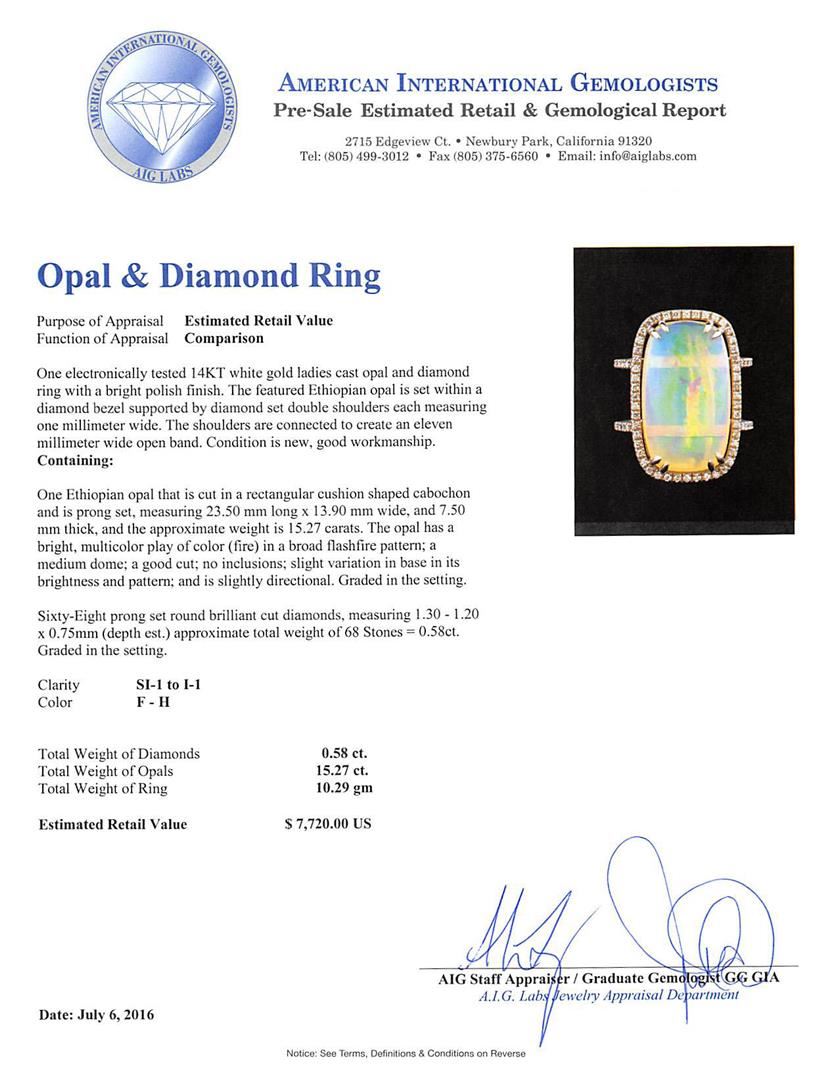 One electronically tested 14KT white gold ladies cast opal and diamond ring with a bright polish finish. The featured Ethiopian opal is set within a diamond bezel supported by diamond set double shoulders each measuring one millimeter wide. The shoulders are connected to create an eleven millimeter wide open band. Condition is new, good workmanship. Containing: One semi crystal opal that is cut in a rectangular cus shaped cabochon and is prong set, measuring 23.50 mm long x 13.90 mm wide, and 7.50 mm thick and the approximate weight is 15.27 carats. The opal has a bright, multicolor play of color (fire) in a broad flashfire pattern; a medium dome; a good cut; no inclusions; slight variation in base in its brightness and pattern; and is slightly directional. Graded in the setting. Sixty-Eight prong set round brilliant cut diamonds, measuring 1.30 - 1.20 x 0.75mm (depth est.) approximate total weight of 68 Stones = 0.58ct. Graded in the setting. Clarity: SI-1 to I-1. Color: F - H. Total Weight of Diamonds 0.58ct. Total Weight of Opals 15.27ct. Total Weight of Ring 10.29gm. AIG Appraised at $7,720.00.