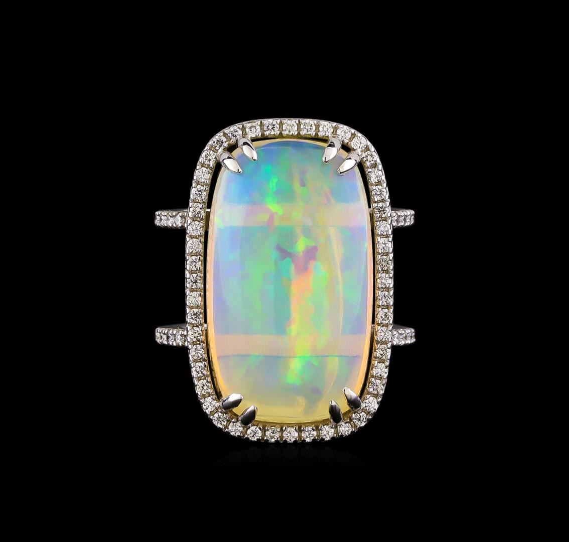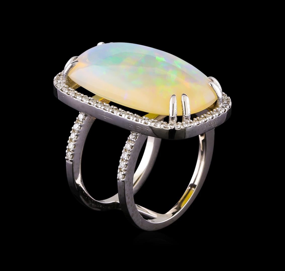 One electronically tested 14KT white gold ladies cast opal and diamond ring with a bright polish finish. The featured Ethiopian opal is set within a diamond bezel supported by diamond set double shoulders each measuring one millimeter wide. The shoulders are connected to create an eleven millimeter wide open band. Condition is new, good workmanship. Containing: One semi crystal opal that is cut in a rectangular cus shaped cabochon and is prong set, measuring 23.50 mm long x 13.90 mm wide, and 7.50 mm thick and the approximate weight is 15.27 carats. The opal has a bright, multicolor play of color (fire) in a broad flashfire pattern; a medium dome; a good cut; no inclusions; slight variation in base in its brightness and pattern; and is slightly directional. Graded in the setting. Sixty-Eight prong set round brilliant cut diamonds, measuring 1.30 - 1.20 x 0.75mm (depth est.) approximate total weight of 68 Stones = 0.58ct. Graded in the setting. Clarity: SI-1 to I-1. Color: F - H. Total Weight of Diamonds 0.58ct. Total Weight of Opals 15.27ct. Total Weight of Ring 10.29gm. AIG Appraised at $7,720.00.
