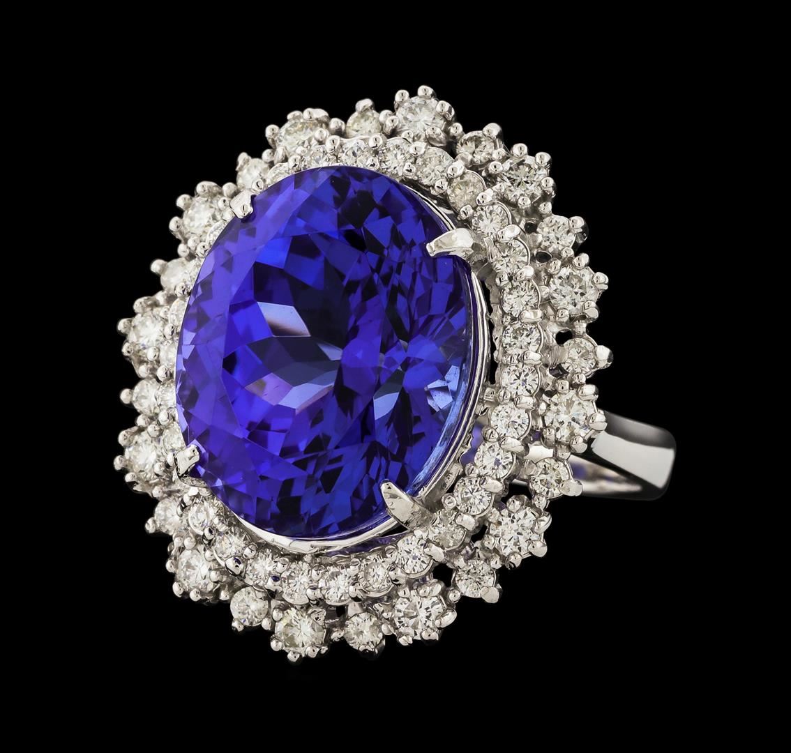 One electronically tested 14KT white gold lady's cast fashion ring with a staggered double basket halo with a bright polish finish. The featured lady's ring has a shank measuring 3.01 millimeters wide. Identified with markings of 'K14'. Condition is new, good workmanship. Containing: One prong set oval modified brilliant cut natural tanzanite, measuring 15.95 x 12.70 x 10.54mm, (depth est.) approximate weight of 15.33ct., clarity is eye clean, medium dark, moderately strong, violetish blue color, (GIA vB 6/4), cut is very good. Transmitting light with no distortion, transparent. Colored gemstones are presumed to have been subjected to commonly used enhancement processes. Graded in the setting. Twelve prong set round brilliant cut diamonds, measuring 2.20 - 2.10 x 1.33mm (depth est.) approximate total weight of 12 Stones = 0.45ct. Graded in the setting. Clarity SI-1 to SI-2. Color: G - H Cut Good Forty-Two prong set round brilliant cut diamonds, measuring 1.70 - 1.60 x 1.01mm (depth est.) approximate total weight of 42 Stones = 0.70ct. Graded in the setting. Clarity SI-1 to SI-2. Color: G - I Cut Good. Total Weight of Colored Stones 15.33ct.. Total Weight of Diamonds 1.15ct.. Total Weight of Ring 11.30gm GAS Appraised at $27,810.00.