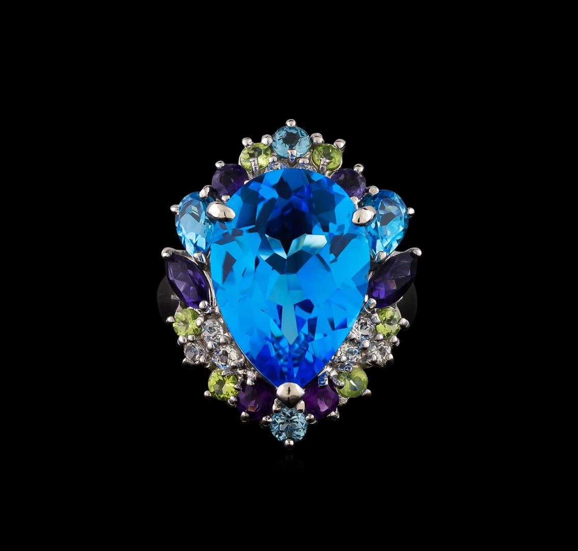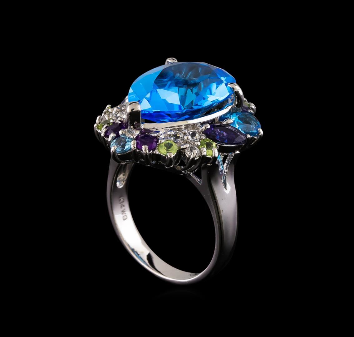 One electronically tested 14KT white gold ladies cast multi gemstone ring with a bright polish finish. The featured blue topaz is set within an elaborate blue topaz, iolite, peridot, blue zircon, amethyst and white sapphire bezel supported by split shoulders, completed by a three millimeter wide band. Identified with markings of "K14". Condition is good. Containing: One prong set pear mixed cut natural blue topaz, measuring 18.20 x 12.90 x 7.60mm, approximate weight of 12.60ct., clarity is eye clean, type I, medium dark, moderately strong, very slightly greenish blue color, (GIA vslgB 6/4), cut is good. Transmitting light with no distortion, transparent. Graded in the setting. Two prong set pear mixed cut natural blue topaz's, measuring 6.00 x 4.00 x 2.60mm, approximate total weight of 0.88ct., clarity is eye clean, type I, medium, moderately strong, very slightly greenish blue color, (GIA vslgB 5/4), cut is good. Transmitting light with no distortion, transparent. Measurements & the color grade are an average for the pair. Graded in the setting. A deposit of a thin layer has been applied to the topaz to produce the intense color effect. The process utilizes a very high temperature treatment, diffusion of ions into the topaz, plus in some cases neutron bombardment has been used to create the color center. Diffusion processes causes the added ions to become part of the crystal surface with no distinct boundary. Do not put a gem treated in this manner into an ultrasonic cleaner. Two prong set marquise mixed cut natural iolites, measuring 6.00 x 3.00 x 1.95mm, approximate total weight of 0.34ct., clarity is eye clean, type II, dark, moderately strong, bluish violet color, (GIA bV 7/4), cut is good. Transmitting light with no distortion, transparent. Measurements & the color grade are an average for the pair. Graded in the setting. Two prong set round mixed cut natural iolites, measuring 3.10 - 3.00 x 1.98 mm, approximate total weight of 0.20ct., clarity is eye clean, type II, medium dark, very slightly grayish, bluish violet color, (GIA bV 6/3), cut is good. Transmitting light with no distortion, transparent. Measurements & the color grade are an average for the pair. Graded in the setting. Six prong set round mixed cut natural peridots, measuring 2.50 - 2.50 x 1.63 mm, approximate total weight of 0.42ct., clarity is eye clean, type II, medium light, very slightly grayish, yellowish green color, (GIA yG 4/3), cut is good. Transmitting light with no distortion, transparent. Measurements & the color grade are an average for the group. Graded in the setting. Two prong set round mixed cut natural blue zircons, measuring 3.10 - 3.10 x 2.02 mm, approximate total weight of 0.36ct., clarity is eye clean, type I, medium light, very slightly grayish, very strongly greenish blue color, (GIA vstgB 4/3), cut is good. Transmitting light with no distortion, transparent. Measurements & the color grade are an average for the pair. Graded in the setting. Two prong set round mixed cut natural amethysts, measuring 3.00 - 3.00 x 1.95 mm, approximate total weight of 0.18ct., clarity is eye clean, type II, medium dark, moderately strong, reddish purple color, (GIA rP 6/4), cut is good. Transmitting light with no distortion, transparent. Measurements & the color grade are an average for the pair. Graded in the setting. Eight prong set round mixed cut natural white sapphires, measuring 2.10 - 2.00 x 1.33 mm, approximate total weight of 0.38ct., clarity is eye clean, colorless, very slightly grayish, white color, (GIA W 0/3), cut is good. Transmitting light with no distortion, transparent. Measurements & the color grade are an average for the group. Graded in the setting. Total Weight of Colored Stones 15.36ct.. Total Weight of Ring 10.49gm. AIG Appraised at $2,210.00.