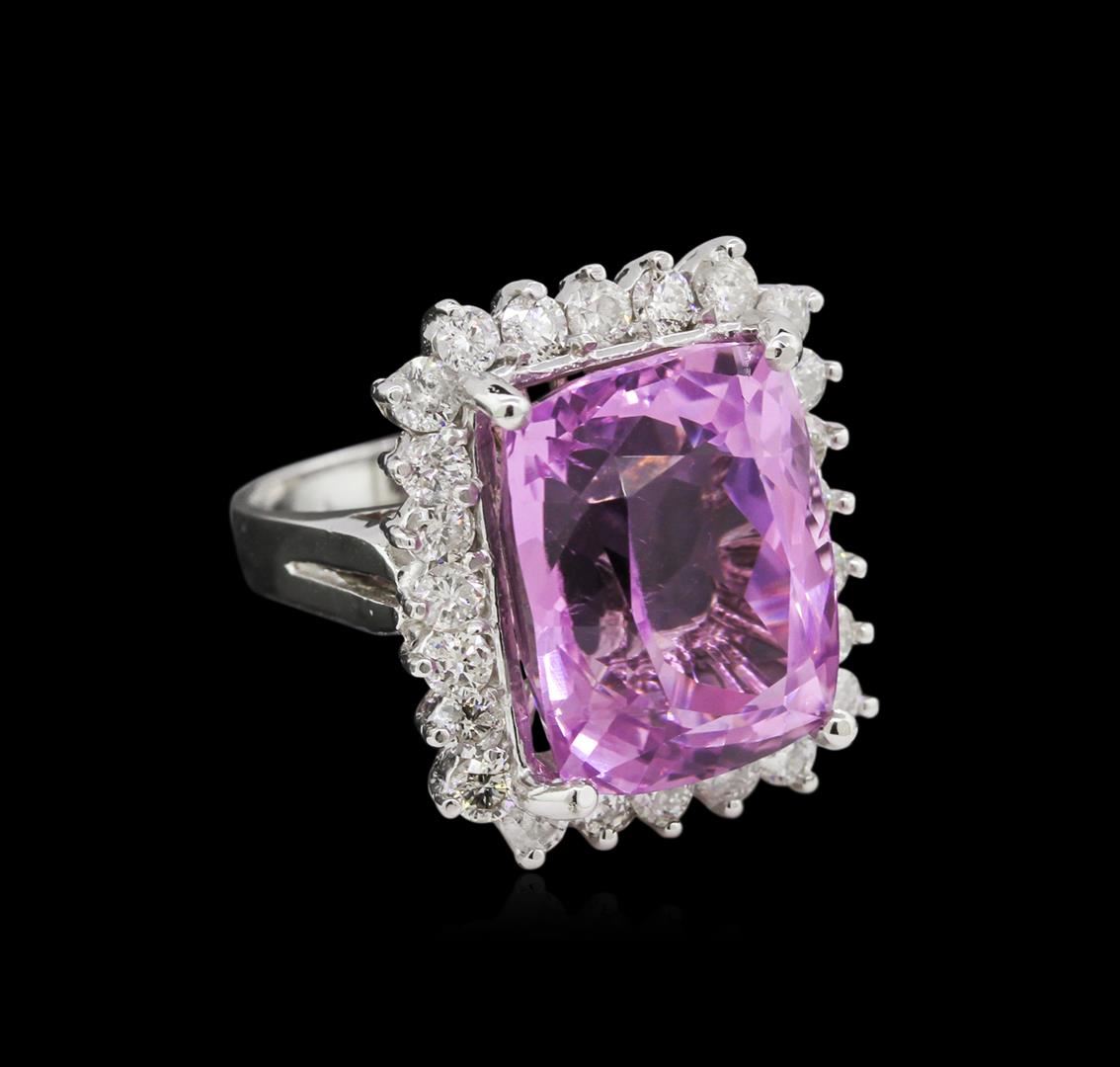 One 14K White Gold Lady's Ring. 10.70 GR. Containing: Main Gemstones: Identity: Kunzite. Carat Weight 15.37 CTS TW. Shape & Measurement: Cushion Shape. Quality: Fine Color. Adjacent Gemstones: Identity: Natural Diamond. Shape: Round Cut. Carat Weight: 0.65 CTS TW. Quality: SI Clarity, G-H Color. All Fine Cutting And Proportions. Total Gemstones Weight: 16.02 CTW TW. RBGS Appraised.