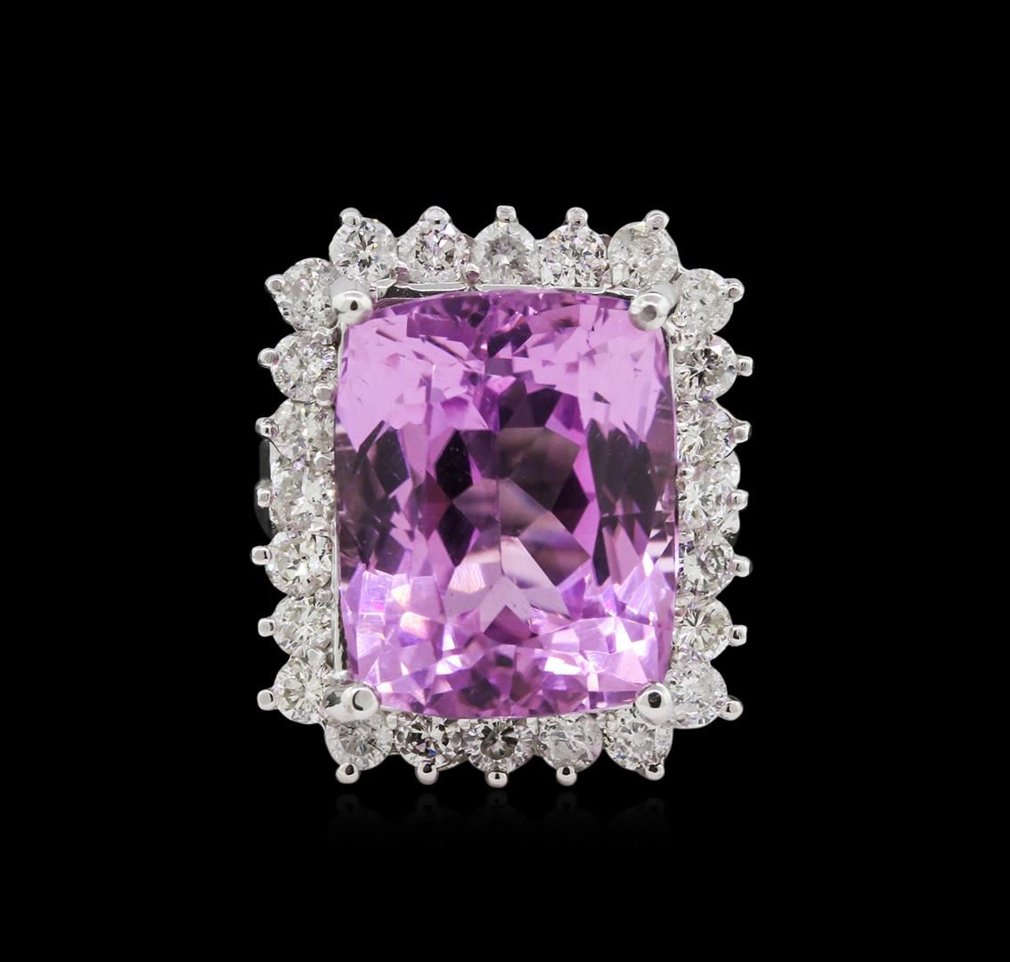 One 14K White Gold Lady's Ring. 10.70 GR. Containing: Main Gemstones: Identity: Kunzite. Carat Weight 15.37 CTS TW. Shape & Measurement: Cushion Shape. Quality: Fine Color. Adjacent Gemstones: Identity: Natural Diamond. Shape: Round Cut. Carat Weight: 0.65 CTS TW. Quality: SI Clarity, G-H Color. All Fine Cutting And Proportions. Total Gemstones Weight: 16.02 CTW TW. RBGS Appraised.