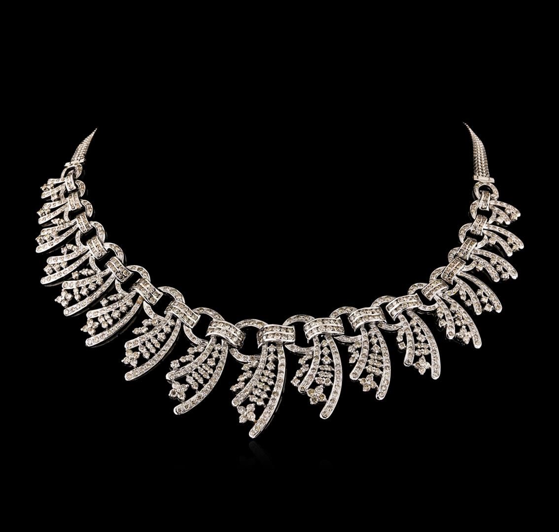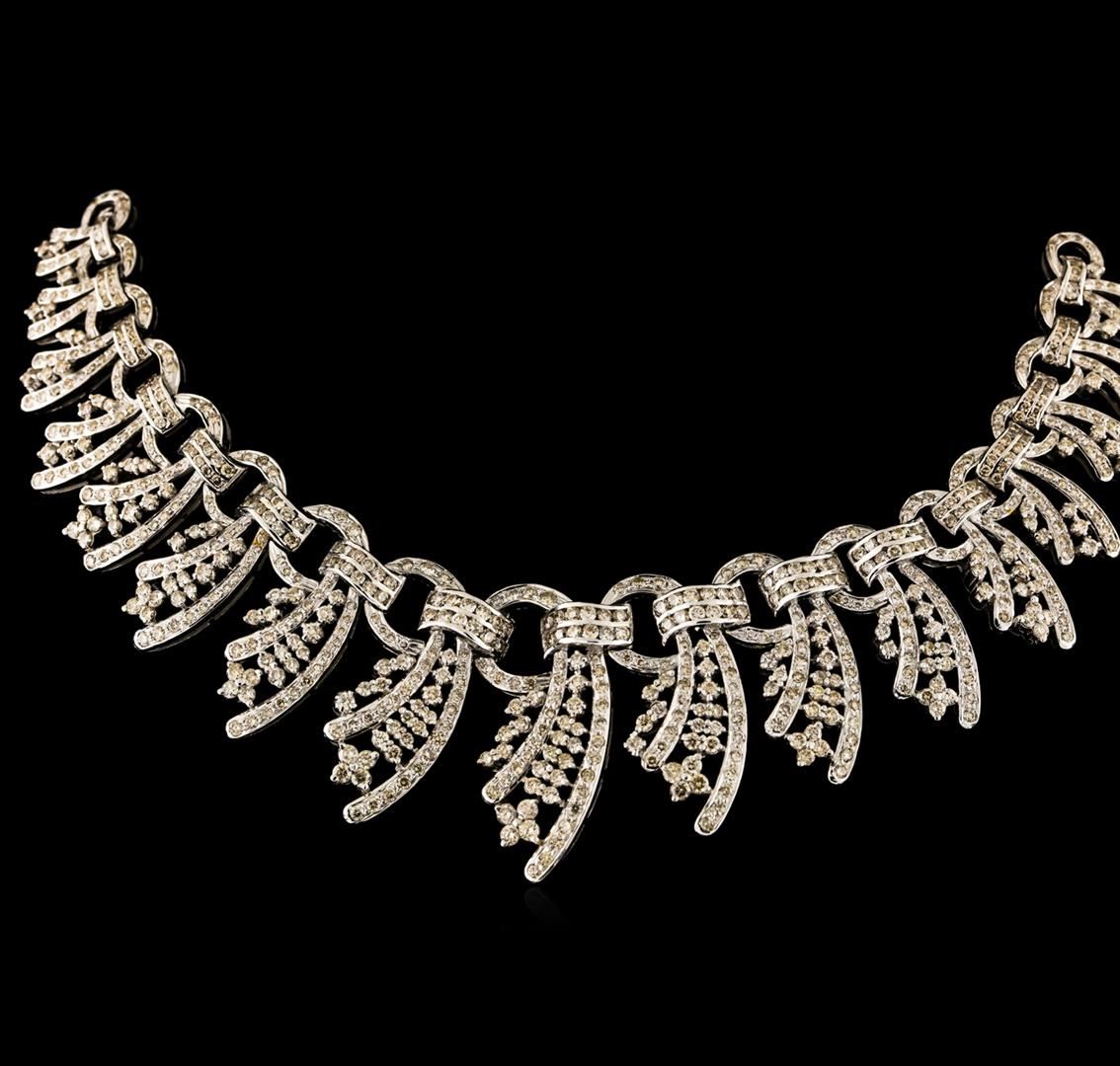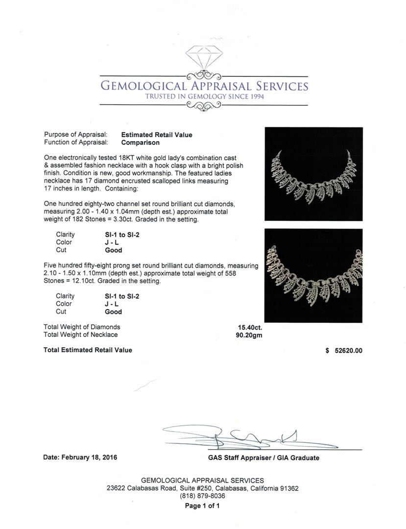 One electronically tested 18KT white gold lady's combination cast & assembled fashion necklace with a hook clasp with a bright polish finish. The featured ladies necklace has 17 diamond encrusted scalloped links measuring 17 inches in length. Condition is new, good workmanship. Containing: One Hundred Eighty-Two channel set round brilliant cut diamonds, measuring 2.00 - 1.40 x 1.04mm (depth est.) approximate total weight of 182 Stones = 3.30ct. Graded in the setting. Clarity: SI-1 to SI-2. Color: J - L. Cut Good Five Hundred Fifty-Eight prong set round brilliant cut diamonds, measuring 2.10 - 1.50 x 1.10mm (depth est.) approximate total weight of 558 Stones = 12.10ct. Graded in the setting. Clarity: SI-1 to SI-2. Color: J - Good. Total Weight of Diamonds 15.40ct. Total Weight of Necklace 90.20gm. GAS Appraised at $52,620.00.