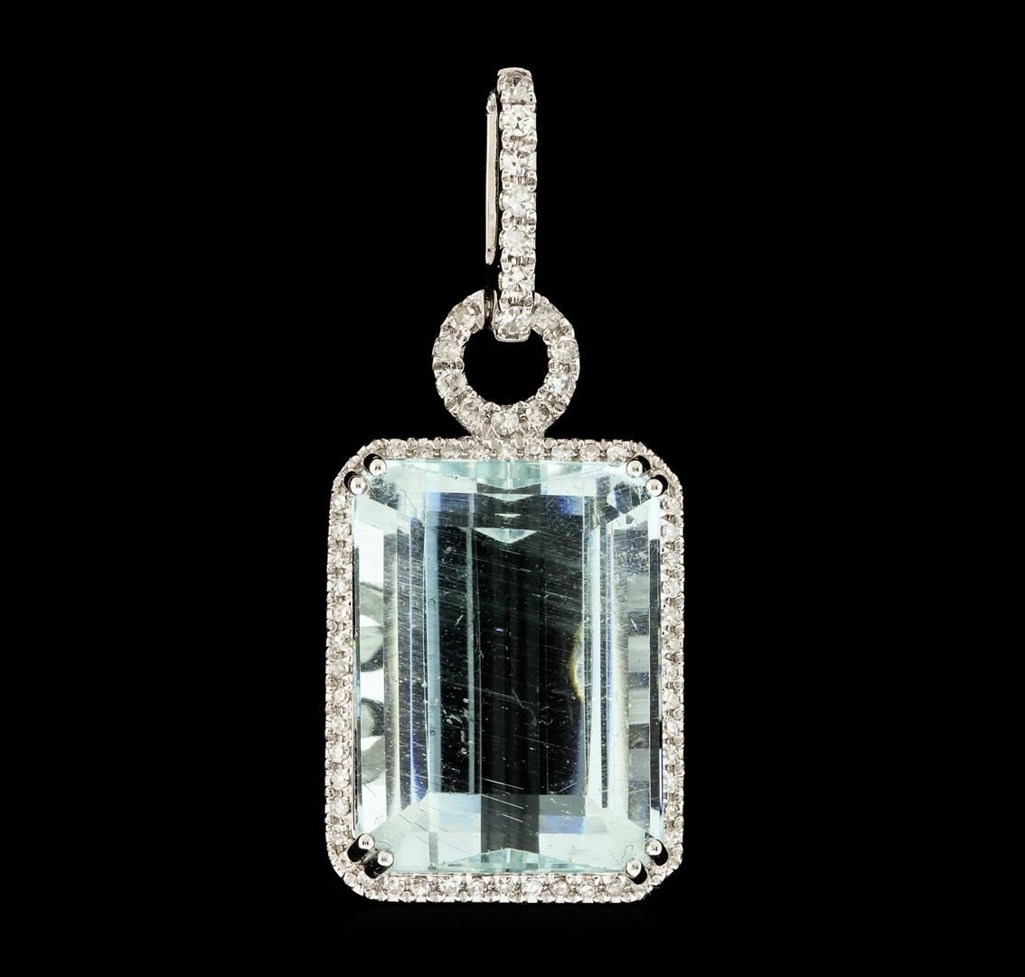One electronically tested 18KT white gold lady's combination cast & assembled fashion pendant with a cushion halo with a bright polish finish. Trademark is MICHA. Identified with markings of '18K 750'. Condition is new, good workmanship. Containing: One prong set emerald standard step cut natural aquamarine, measuring 17.15 x 12.86 x 8.65mm, (depth est.) 10%. bulge factor, approximate weight of 15.42ct., clarity is slightly included, very light, moderately strong, very slightly greenish blue color, (GIA vslgB 2/4), cut is good. Transmitting light with a minimum of distortion, transparent. Colored gemstones are presumed to have been subjected to commonly used enhancement processes. Graded in the setting. Sixteen prong set single cut diamonds, measuring 1.40 - 1.35 x 0.86mm (depth est.) approximate total weight of 16 Stones = 0.16ct. Graded in the setting. Clarity SI-1 to I-1. Color: H - I Cut Good Fifty-Two prong set single cut diamonds, measuring 0.90 - 0.80 x 0.53mm (depth est.) approximate total weight of 52 Stones = 0.12ct. Graded in the setting. Clarity SI-1 to I-1. Color: H - I Cut Good. Total Weight of Colored Stones 15.42ct.. Total Weight of Diamonds 0.28ct.. Total Weight of Pendant 6.50gm. GAS Appraised at $8,545.00.