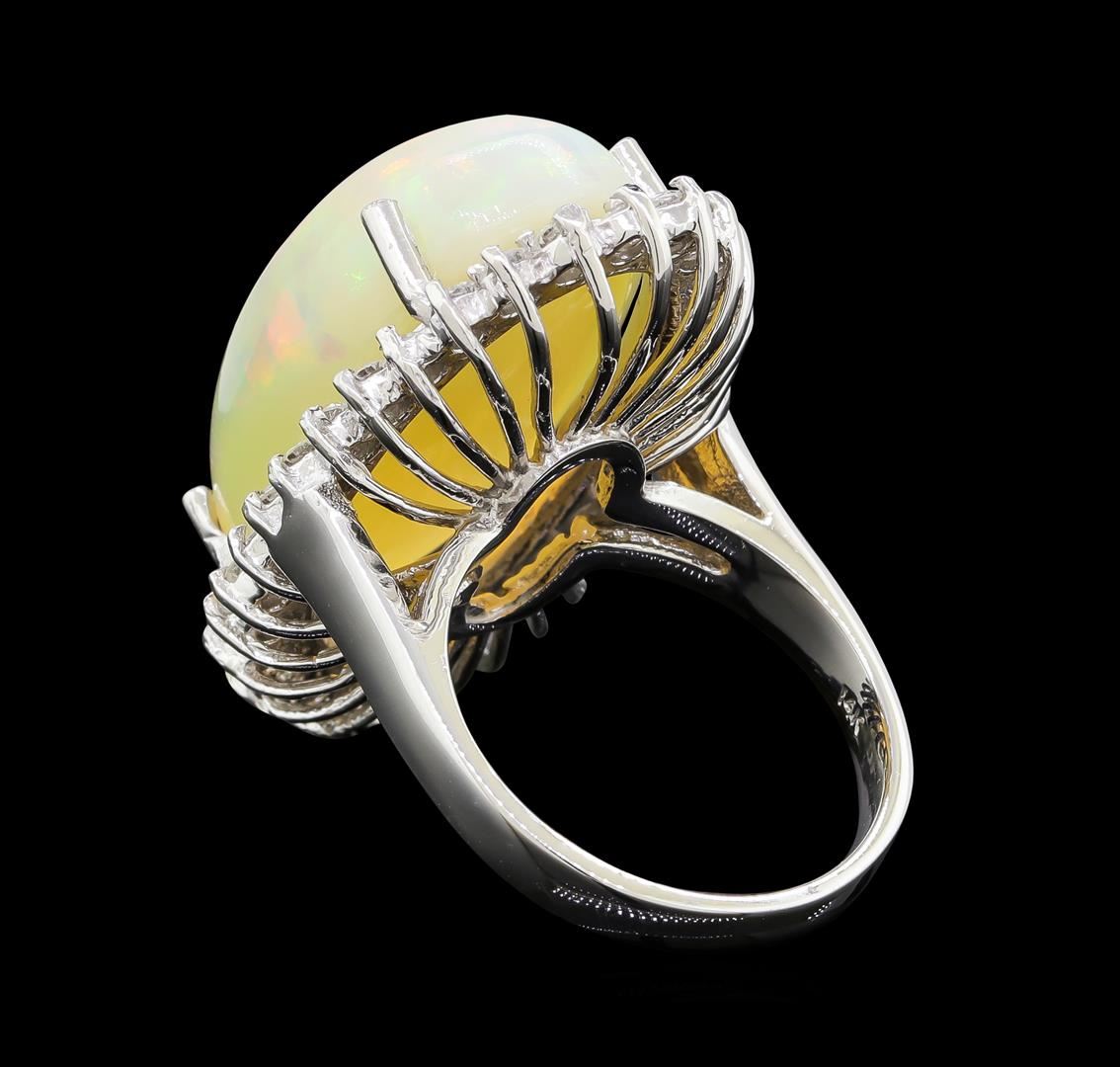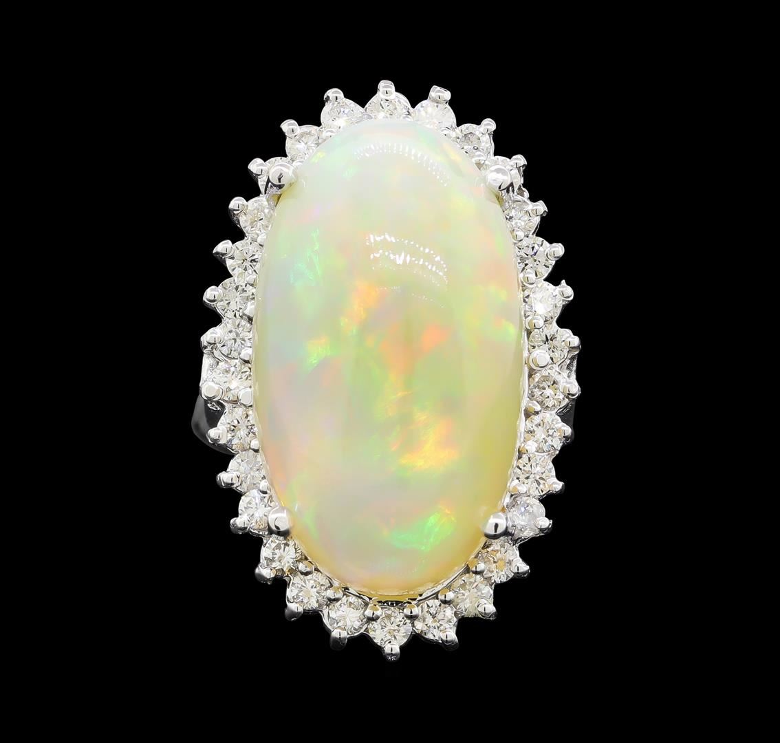 One electronically tested 14KT white gold lady's cast fashion ring with a basket halo with a bright polish finish. The featured lady's ring has a shank measuring 2.80 millimeters wide. Identified with markings of '14K'. Condition is new, good workmanship. Containing: One crystal opal that is cut in a oval shaped cabochon and is prong set, measuring 23.40 mm long x 13.39 mm wide, and 9.82 mm thick and the approximate weight is 15.46 carats. The opal has a somewhat bright, orange-green play of color (fire) in a rolling flashfire pattern; a high dome; a good cut; slightly included; minor dull spot in its brightness and pattern; and is slightly directional. Graded in the setting. Thirty prong set round brilliant cut diamonds, measuring 2.10 - 2.00 x 1.25mm (depth est.) approximate total weight of 30 Stones = 0.96ct. Graded in the setting. Clarity SI-1 to I-1. Color: H - I Cut Good. Total Weight of Diamonds 0.96ct.. Total Weight of Opals 15.46ct.. Total Weight of Ring 10.70gm. GAS Appraised at $8,985.00.
