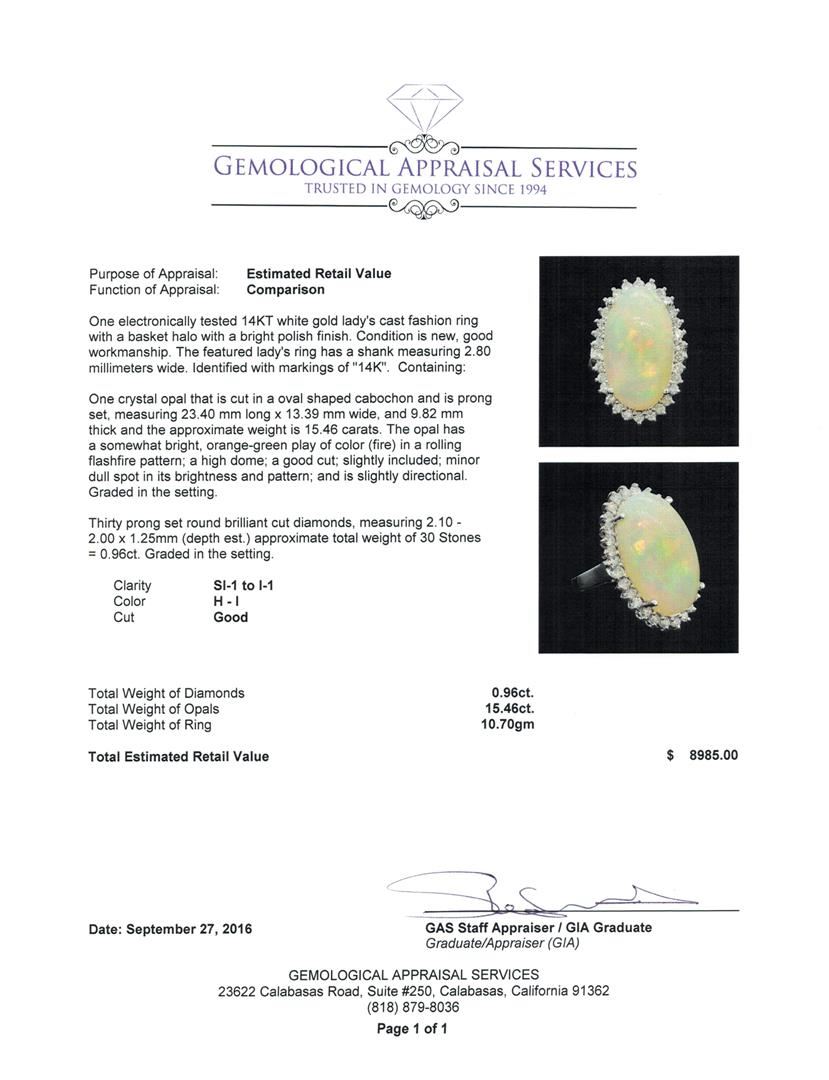 One electronically tested 14KT white gold lady's cast fashion ring with a basket halo with a bright polish finish. The featured lady's ring has a shank measuring 2.80 millimeters wide. Identified with markings of '14K'. Condition is new, good workmanship. Containing: One crystal opal that is cut in a oval shaped cabochon and is prong set, measuring 23.40 mm long x 13.39 mm wide, and 9.82 mm thick and the approximate weight is 15.46 carats. The opal has a somewhat bright, orange-green play of color (fire) in a rolling flashfire pattern; a high dome; a good cut; slightly included; minor dull spot in its brightness and pattern; and is slightly directional. Graded in the setting. Thirty prong set round brilliant cut diamonds, measuring 2.10 - 2.00 x 1.25mm (depth est.) approximate total weight of 30 Stones = 0.96ct. Graded in the setting. Clarity SI-1 to I-1. Color: H - I Cut Good. Total Weight of Diamonds 0.96ct.. Total Weight of Opals 15.46ct.. Total Weight of Ring 10.70gm. GAS Appraised at $8,985.00.