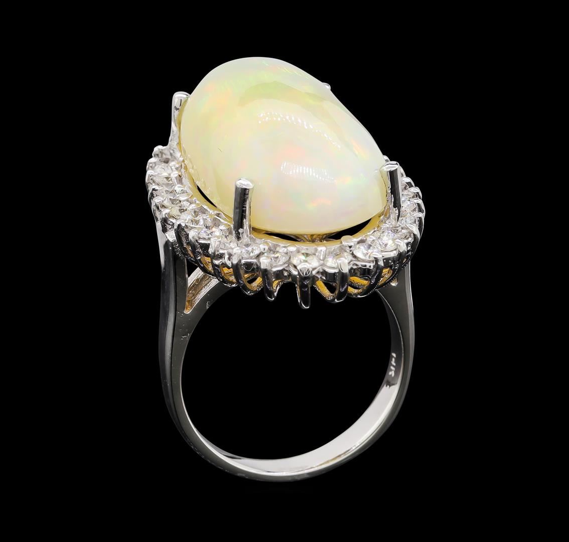 One electronically tested 14KT white gold lady's cast fashion ring with a basket halo with a bright polish finish. The featured lady's ring has a shank measuring 2.80 millimeters wide. Identified with markings of '14K'. Condition is new, good workmanship. Containing: One crystal opal that is cut in a oval shaped cabochon and is prong set, measuring 23.40 mm long x 13.39 mm wide, and 9.82 mm thick and the approximate weight is 15.46 carats. The opal has a somewhat bright, orange-green play of color (fire) in a rolling flashfire pattern; a high dome; a good cut; slightly included; minor dull spot in its brightness and pattern; and is slightly directional. Graded in the setting. Thirty prong set round brilliant cut diamonds, measuring 2.10 - 2.00 x 1.25mm (depth est.) approximate total weight of 30 Stones = 0.96ct. Graded in the setting. Clarity SI-1 to I-1. Color: H - I Cut Good. Total Weight of Diamonds 0.96ct.. Total Weight of Opals 15.46ct.. Total Weight of Ring 10.70gm. GAS Appraised at $8,985.00.