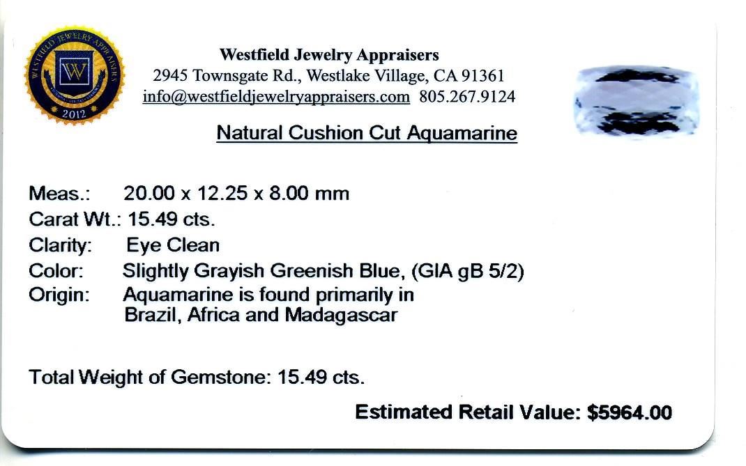 15.49ct Cushion Cut Natural Cushion Cut Aquamarine. Westfield Appraised at $5,964.00.