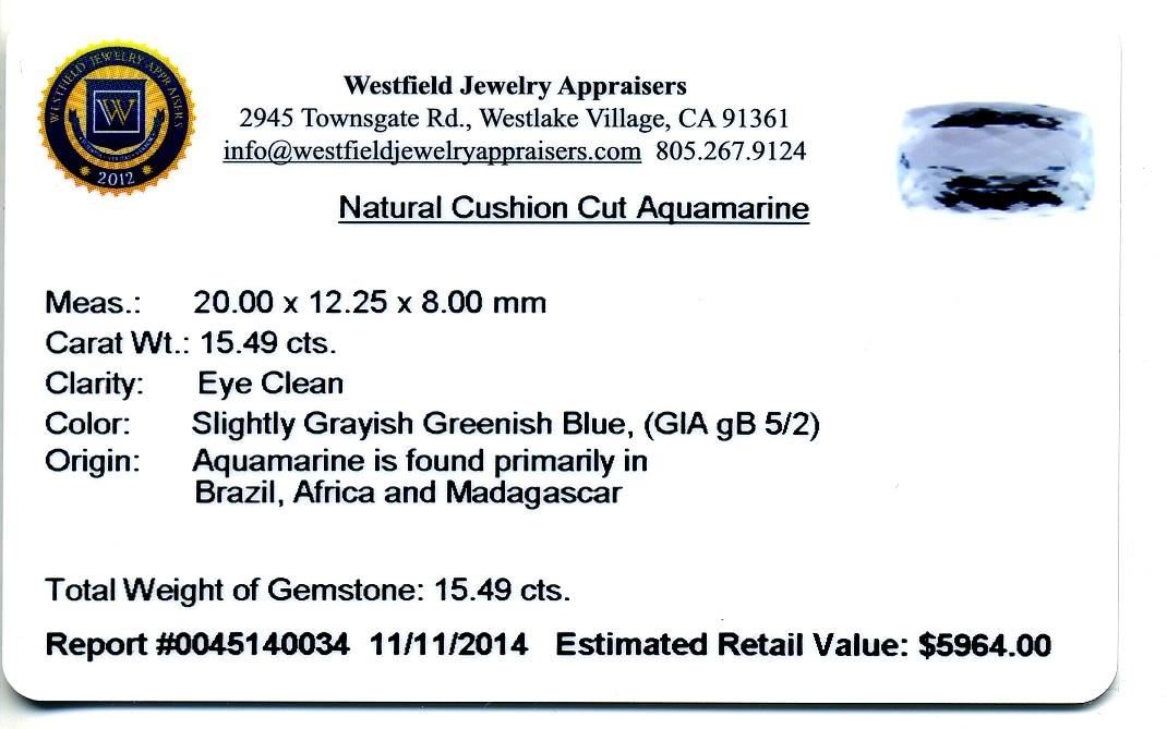 15.49ct Cushion Cut Natural Cushion Cut Aquamarine. Westfield Appraised at $5,964.00.