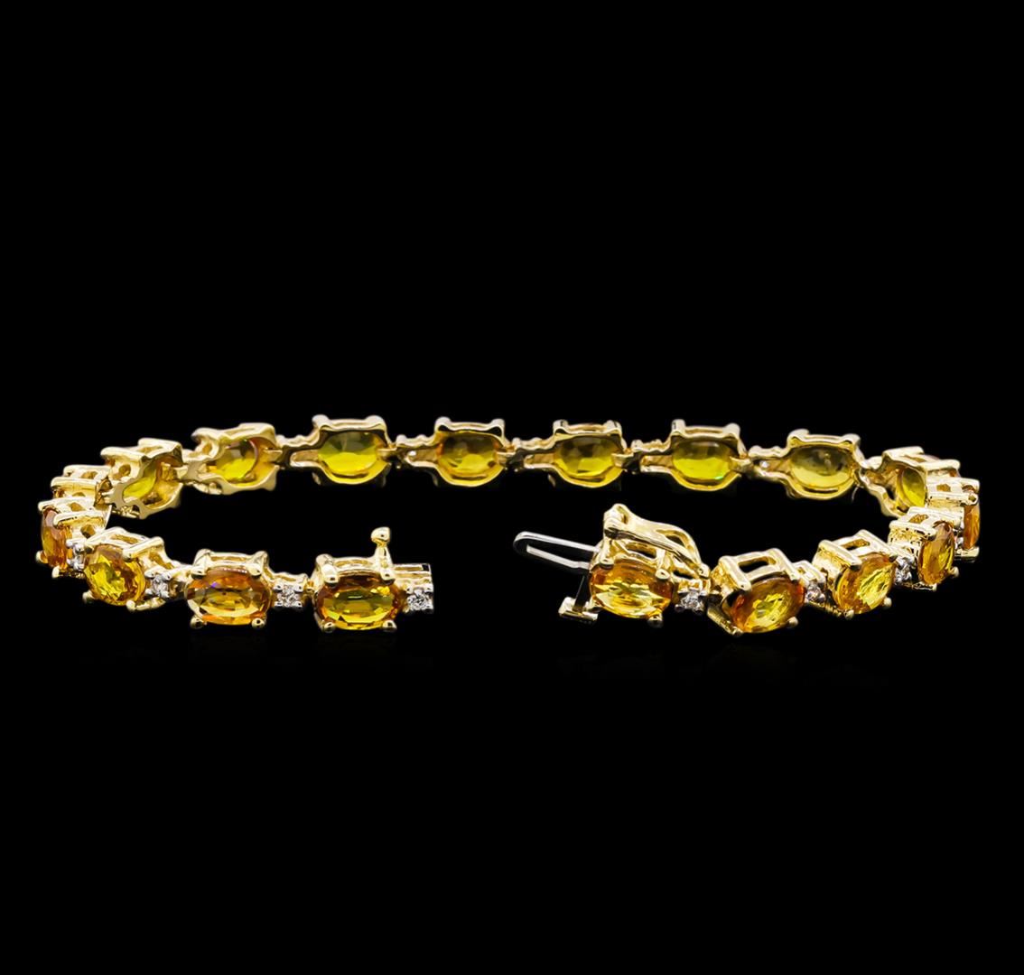 One electronically tested 14KT yellow gold lady's combination cast & assembled fashion straight line bracelet with a tongue clasp with foldover safety with a bright polish finish. The featured lady's bracelet has a length measuring 7.25 inches. Identified with markings of "14K". Condition is new, good workmanship. Containing: Eighteen prong set oval modified brilliant cut natural yellow sapphires, measuring 7.05 x 5.05 x 2.80mm, (depth est.) approximate total weight of 15.57ct., clarity is slightly included, medium light, moderately strong, orangy yellow color, (GIA oY 4/4), cut is good. Transmitting light with a minimum of distortion, transparent. Colored gemstones are presumed to have been subjected to commonly used enhancement processes. Graded in the setting. Eighteen prong set round brilliant cut diamonds, measuring 1.90 - 1.80 x 1.15mm (depth est.) approximate total weight of 18 Stones = 0.45ct. Graded in the setting. Clarity: SI-1 to SI-2. Color: G - H. Cut Good. Total Weight of Colored Stones 15.57ct. Total Weight of Diamonds 0.45ct. Total Weight of Straight Line Bracelet 17.90gm. GAS Appraised.