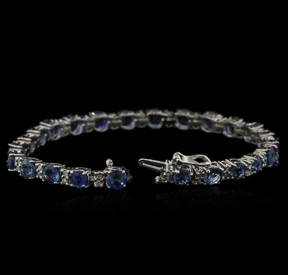 One electronically tested 14KT white gold ladies cast sapphire and diamond bracelet with a hidden box clasp with safety closer with a bright polish finish. 7.00." in length Condition is new. Containing: Twenty-four prong set round modified brilliant cut natural blue sapphires, measuring 5.00 - 5.00 x 3.25 mm, approximate total weight of 15.60ct., clarity is moderately included, type II, light, very slightly grayish, blue color, (GIA B 3/3), cut is good. Forty-Eight prong set round brilliant cut diamonds, measuring 1.00 - 1.40 x 0.72mm (depth est.) approximate total weight of 48 Stones = 0.30ct. Clarity: I-1 to I-2. Color: I - J, Cut is Good. Colored gemstones are presumed to have been subjected to commonly used enhancement processes. All diamonds and colored gemstones are graded in the mounting, unless otherwise stated. Total Weight of Colored Stones 15.60ct. Total Weight of Diamonds 0.30ct. Total Weight of Bracelet 17.00 grams. GGL Appraised at $5,295.00.