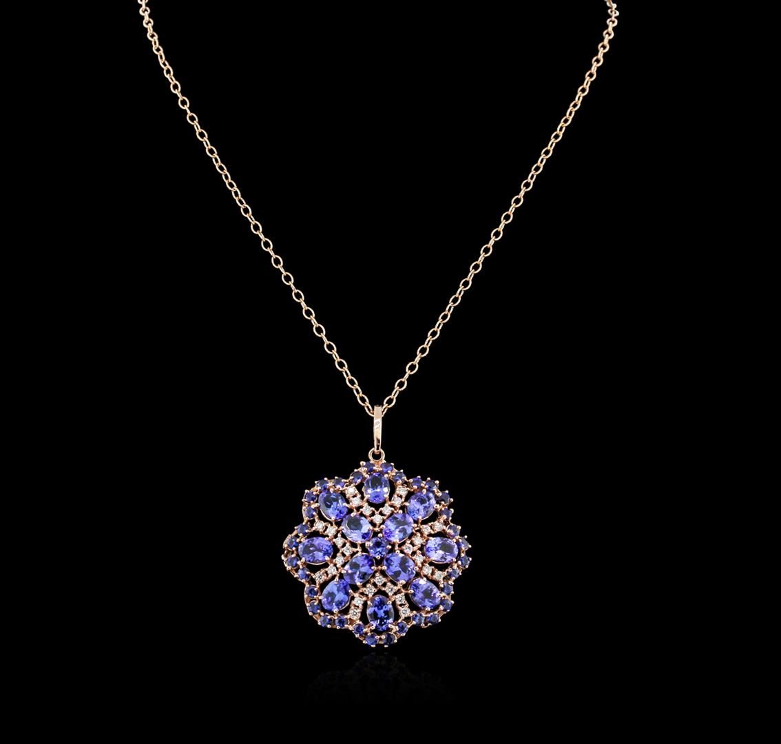 One electronically tested 14KT rose gold ladies cast & assembled tanzanite, sapphire and diamond pendant with chain. The pendant features an elaborate tanzanite and diamond lattice set within a sapphire bezel, completed by a rose gold bail. The pendant is supported by an eighteen inch length rose gold diamond cut link chain, terminating in a lobster claw clasp. Bright polish finish. Identified with markings of "14K". Condition is new, good workmanship. Containing: Twelve prong set oval mixed cut natural tanzanites approximate total weight of 15.60ct., clarity is eye clean, type I, dark, very slightly grayish, violetish blue color, (GIA vB 7/3), cut is good. Transmitting light with no distortion, transparent. Color grade is an average for the group. Graded in the setting. Tanzanite is a very rare gemstone that is only found in the country of Tanzania. Originally discovered in 1967. Tiffany & Company, named the stone Tanzanite. It is found in the Usumburu Mountains that border the Umba Valley of northern Tanzania. Tanzanite occurs in gray, brown, violet, blue, reddish-purple, & green. The gem is interesting because of its exceptional pleochroism. Rotated in different directions a tanzanite will exhibit multiple changes of color. Tanzanite has a low tolerance to ultrasonic cleaning, and should not be cleaned using this method. Thirty-three prong set round mixed cut natural blue sapphires approximate total weight of 4.30ct., clarity is slightly included, type II, dark, moderately strong, blue color, (GIA B 7/4), cut is good. Transmitting light with a minimum of distortion, transparent. Naturally occurring internal & external characteristics are present. Color grade is an average for the group. Indications of laboratory high temperature diffusion treatment. Graded in the setting. Twenty-Eight prong set round brilliant cut diamonds approximate total weight of 28 Stones = 0.90ct. Graded in the setting. Clarity SI-1 to SI-2 Color H - J. Total Weight of Colored Stones 19.90ct. Total Weight of Diamonds 0.90ct. Total Weight of Pendant With Chain 24.10 grams. AIG Appraised at $28,155.00.