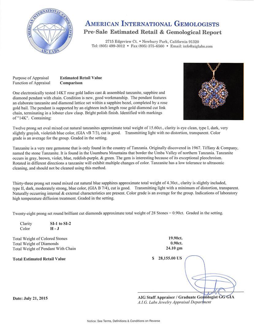 One electronically tested 14KT rose gold ladies cast & assembled tanzanite, sapphire and diamond pendant with chain. The pendant features an elaborate tanzanite and diamond lattice set within a sapphire bezel, completed by a rose gold bail. The pendant is supported by an eighteen inch length rose gold diamond cut link chain, terminating in a lobster claw clasp. Bright polish finish. Identified with markings of "14K". Condition is new, good workmanship. Containing: Twelve prong set oval mixed cut natural tanzanites approximate total weight of 15.60ct., clarity is eye clean, type I, dark, very slightly grayish, violetish blue color, (GIA vB 7/3), cut is good. Transmitting light with no distortion, transparent. Color grade is an average for the group. Graded in the setting. Tanzanite is a very rare gemstone that is only found in the country of Tanzania. Originally discovered in 1967. Tiffany & Company, named the stone Tanzanite. It is found in the Usumburu Mountains that border the Umba Valley of northern Tanzania. Tanzanite occurs in gray, brown, violet, blue, reddish-purple, & green. The gem is interesting because of its exceptional pleochroism. Rotated in different directions a tanzanite will exhibit multiple changes of color. Tanzanite has a low tolerance to ultrasonic cleaning, and should not be cleaned using this method. Thirty-three prong set round mixed cut natural blue sapphires approximate total weight of 4.30ct., clarity is slightly included, type II, dark, moderately strong, blue color, (GIA B 7/4), cut is good. Transmitting light with a minimum of distortion, transparent. Naturally occurring internal & external characteristics are present. Color grade is an average for the group. Indications of laboratory high temperature diffusion treatment. Graded in the setting. Twenty-Eight prong set round brilliant cut diamonds approximate total weight of 28 Stones = 0.90ct. Graded in the setting. Clarity SI-1 to SI-2 Color H - J. Total Weight of Colored Stones 19.90ct. Total Weight of Diamonds 0.90ct. Total Weight of Pendant With Chain 24.10 grams. AIG Appraised at $28,155.00.