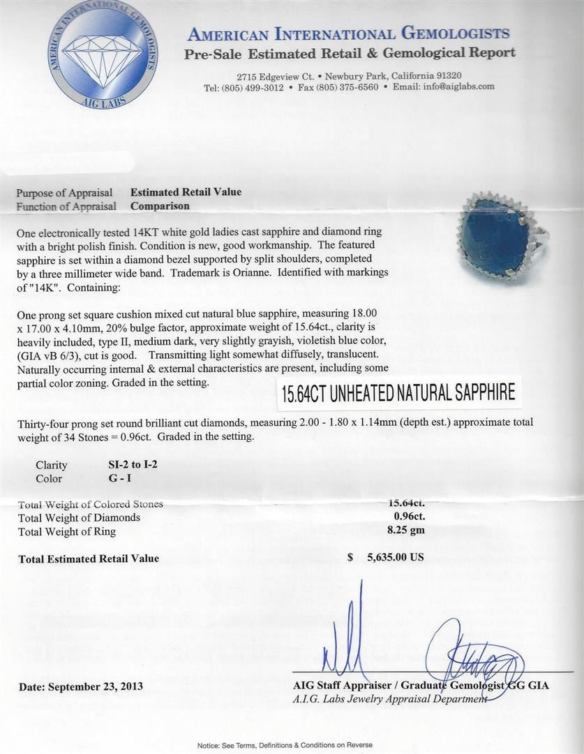 One electronically tested 14KT white gold ladies cast sapphire and diamond ring with a bright polish finish. The featured sapphire is set within a diamond bezel supported by split shoulders, completed by a three millimeter wide band. Trademark is Orianne. Identified with markings of "14K". Condition is new, good workmanship. Containing: One prong set square cushion mixed cut natural blue sapphire, measuring 18.00 x 17.00 x 4.10mm, 20%. bulge factor, approximate weight of 15.64ct., clarity is heavily included, type II, medium dark, very slightly grayish, violetish blue color, (GIA vB 6/3), cut is good. Transmitting light somewhat diffusely, translucent. Naturally occurring internal & external characteristics are present, including some partial color zoning. Graded in the setting. Thirty-Four prong set round brilliant cut diamonds, measuring 2.00 - 1.80 x 1.14mm (depth est.) approximate total weight of 34 Stones = 0.96ct. Graded in the setting. Clarity: SI-2 to I-2. Color: G - I. Total Weight of Colored Stones 15.64ct. Total Weight of Diamonds 0.96ct. AIG Appraised at $5,635.00.