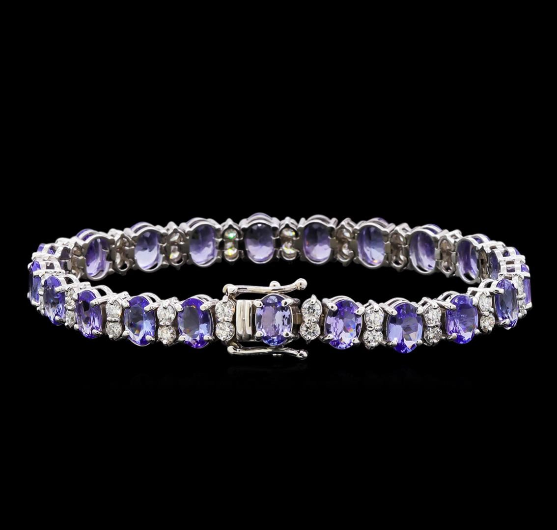 One electronically tested 14KT white gold lady's combination cast & assembled fashion straight line bracelet with a tongue clasp with foldover safety with a bright polish finish. The featured lady's bracelet is 7 inches in length. Identified with markings of "14K". Condition is new, good workmanship. Containing: Twenty-one prong set oval modified brilliant cut natural tanzanites, measuring 7.10 x 5.05 x 3.10mm, (depth est.) approximate total weight of 15.66ct., clarity is eye clean, medium, moderately strong, violetish blue color, (GIA vB 5/4), cut is good. Transmitting light with no distortion, transparent. Colored gemstones are presumed to have been subjected to commonly used enhancement processes. Graded in the setting. Forty-Two prong set round brilliant cut diamonds, measuring 2.60 - 2.50 x 1.58mm (depth est.) approximate total weight of 42 Stones = 2.56ct. Graded in the setting. Clarity: VS-2 to SI-2. Color: G - I. Cut Good. Total Weight of Colored Stones 15.66ct. Total Weight of Diamonds 2.56ct. Total Weight of Straight Line Bracelet 18.30gm. GAS Appraised at $19,705.00.