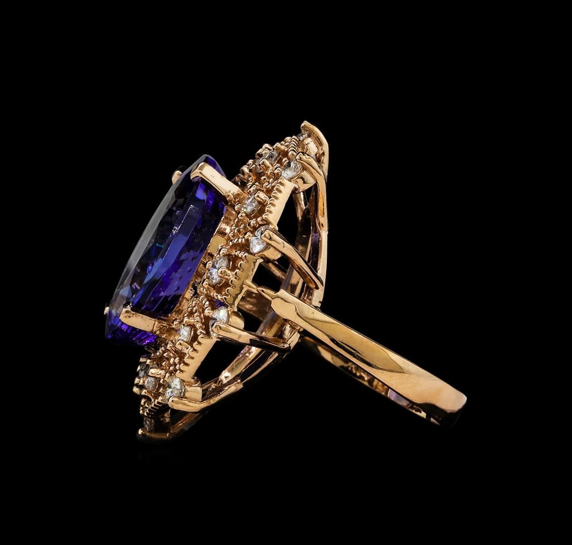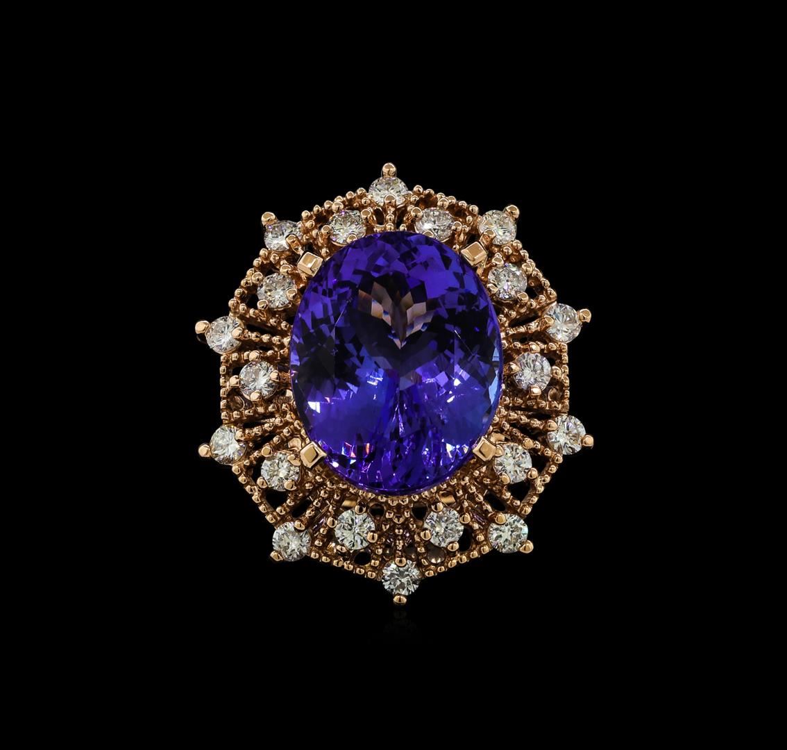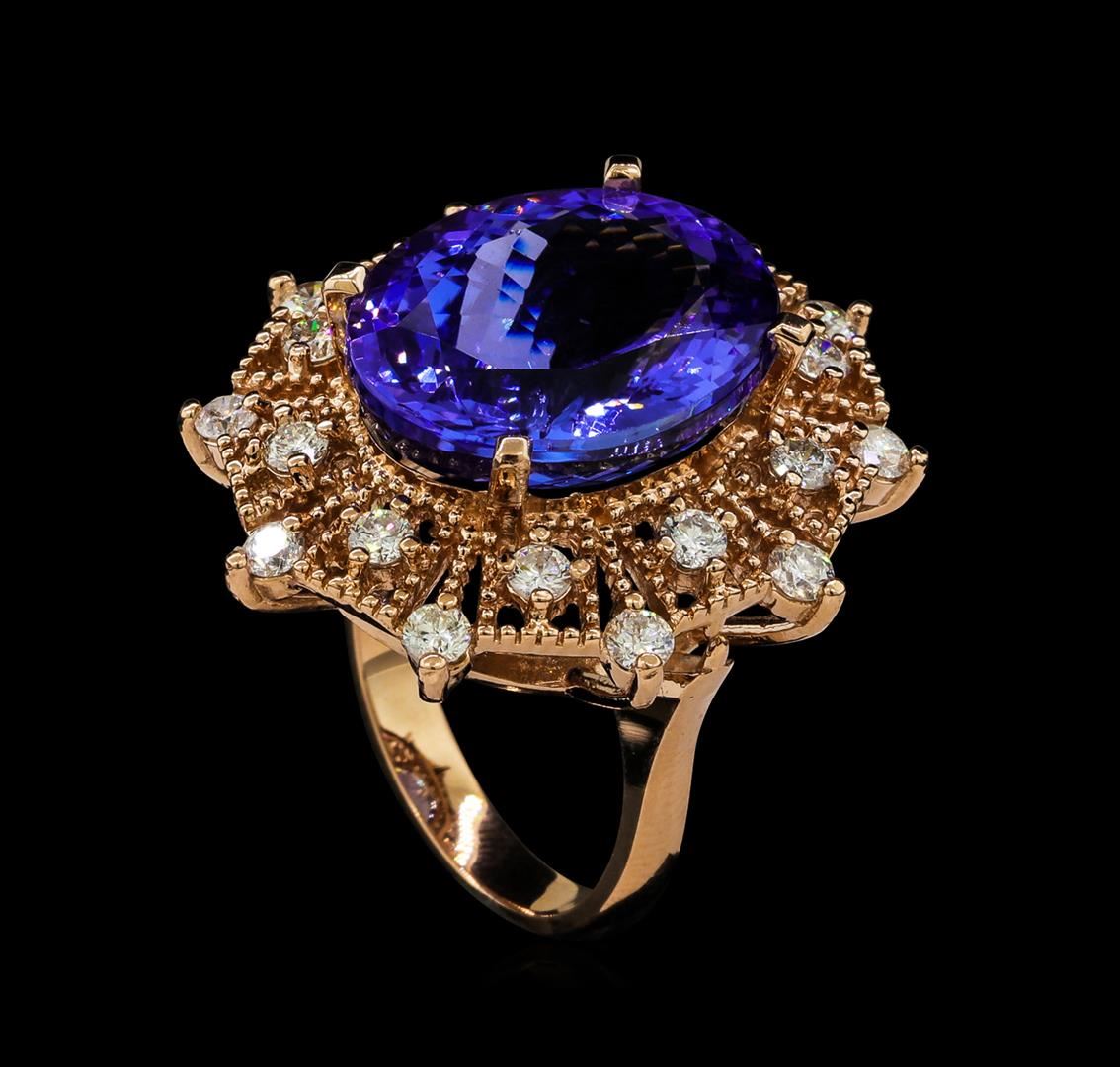 One electronically tested 14KT rose gold lady's cast fashion ring with a double basket halo with a bright polish with milgrain detailing finish. The featured lady's ring has a shank measuring 3.22 millimeters wide. Identified with markings of 'K14'. Condition is new, good workmanship. Containing: One prong set oval modified brilliant cut natural tanzanite, measuring 17.62 x 13.72 x 8.80mm, (depth est.) 5%. bulge factor, approximate weight of 15.76ct., clarity is eye clean, medium, very slightly grayish, violet color, (GIA V 5/3), cut is very good. Transmitting light with no distortion, transparent. Colored gemstones are presumed to have been subjected to commonly used enhancement processes. Graded in the setting. Twenty prong set round brilliant cut diamonds, measuring 2.60 - 2.50 x 1.58mm (depth est.) approximate total weight of 20 Stones = 1.28ct. Graded in the setting. Clarity SI-1 to I-1. Color: H - I Cut Good. Total Weight of Colored Stones 15.76ct.. Total Weight of Diamonds 1.28ct.. Total Weight of Ring 12.50gm GAS Appraised at $23,035.00.
