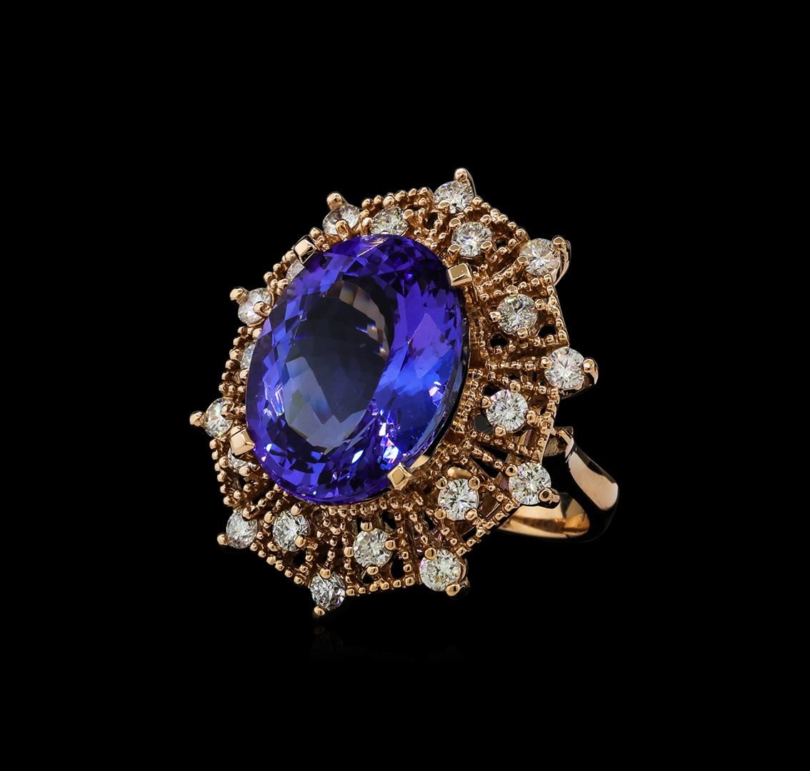 One electronically tested 14KT rose gold lady's cast fashion ring with a double basket halo with a bright polish with milgrain detailing finish. The featured lady's ring has a shank measuring 3.22 millimeters wide. Identified with markings of 'K14'. Condition is new, good workmanship. Containing: One prong set oval modified brilliant cut natural tanzanite, measuring 17.62 x 13.72 x 8.80mm, (depth est.) 5%. bulge factor, approximate weight of 15.76ct., clarity is eye clean, medium, very slightly grayish, violet color, (GIA V 5/3), cut is very good. Transmitting light with no distortion, transparent. Colored gemstones are presumed to have been subjected to commonly used enhancement processes. Graded in the setting. Twenty prong set round brilliant cut diamonds, measuring 2.60 - 2.50 x 1.58mm (depth est.) approximate total weight of 20 Stones = 1.28ct. Graded in the setting. Clarity SI-1 to I-1. Color: H - I Cut Good. Total Weight of Colored Stones 15.76ct.. Total Weight of Diamonds 1.28ct.. Total Weight of Ring 12.50gm GAS Appraised at $23,035.00.