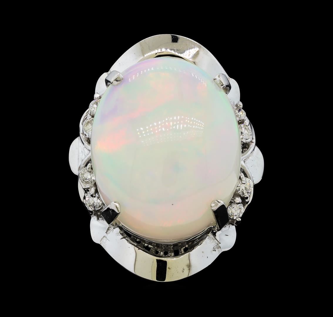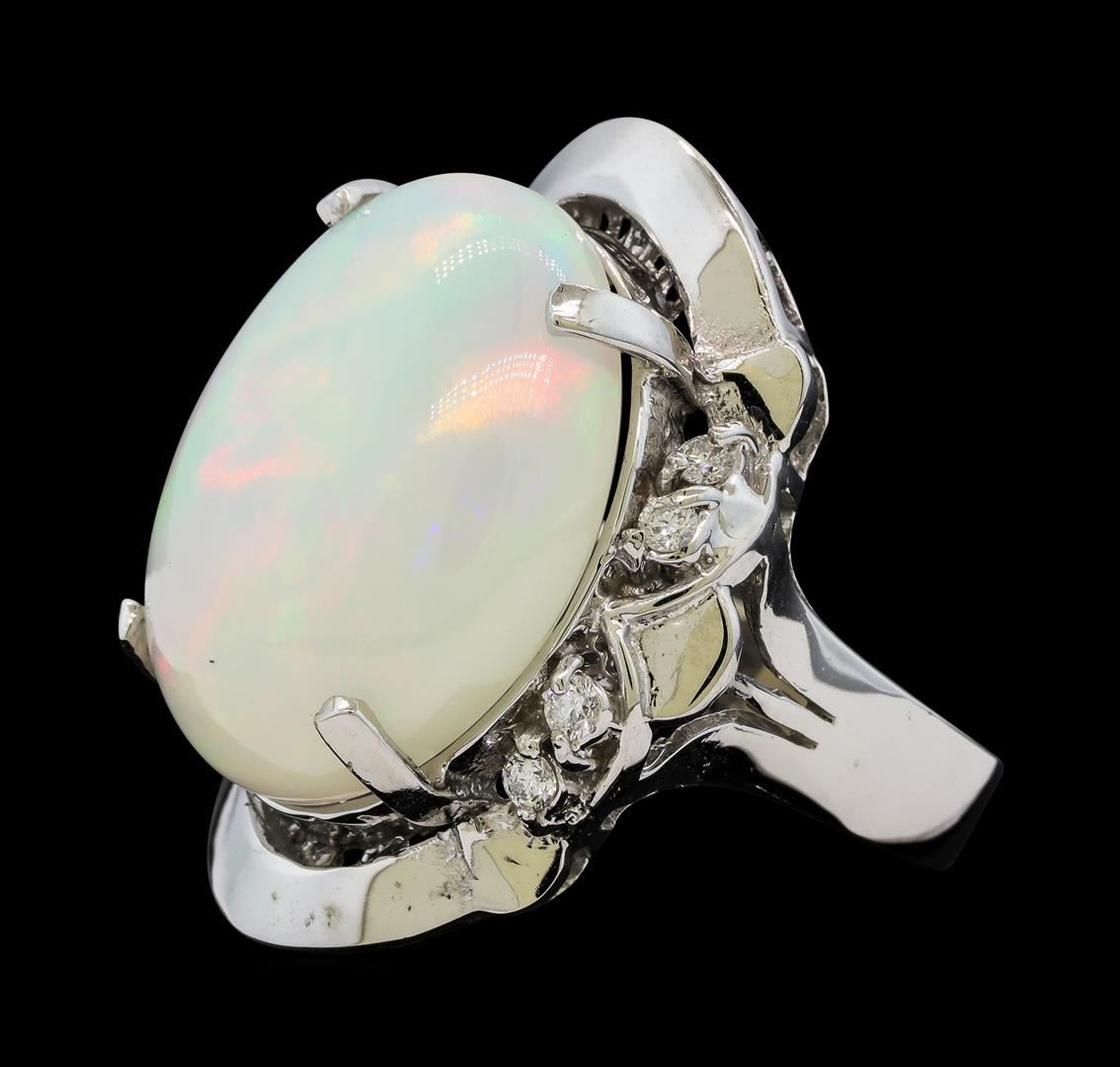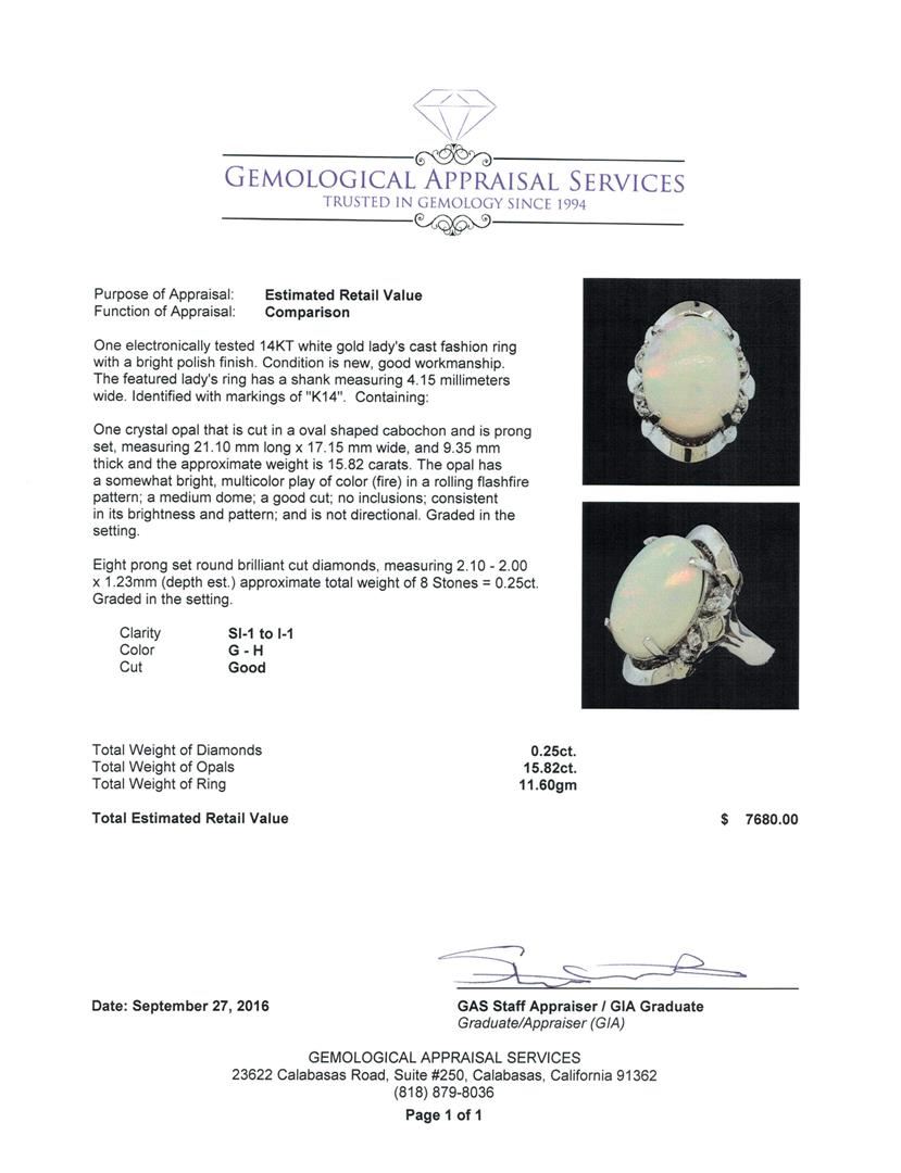 One electronically tested 14KT white gold lady's cast fashion ring with a bright polish finish. The featured lady's ring has a shank measuring 4.15 millimeters wide. Identified with markings of 'K14'. Condition is new, good workmanship. Containing: One crystal opal that is cut in a oval shaped cabochon and is prong set, measuring 21.10 mm long x 17.15 mm wide, and 9.35 mm thick and the approximate weight is 15.82 carats. The opal has a somewhat bright, multicolor play of color (fire) in a rolling flashfire pattern; a medium dome; a good cut; no inclusions; consistent in its brightness and pattern; and is not directional. Graded in the setting. Eight prong set round brilliant cut diamonds, measuring 2.10 - 2.00 x 1.23mm (depth est.) approximate total weight of 8 Stones = 0.25ct. Graded in the setting. Clarity SI-1 to I-1. Color: G - H Cut Good. Total Weight of Diamonds 0.25ct.. Total Weight of Opals 15.82ct.. Total Weight of Ring 11.60gm. GAS Appraised at $7,680.00.