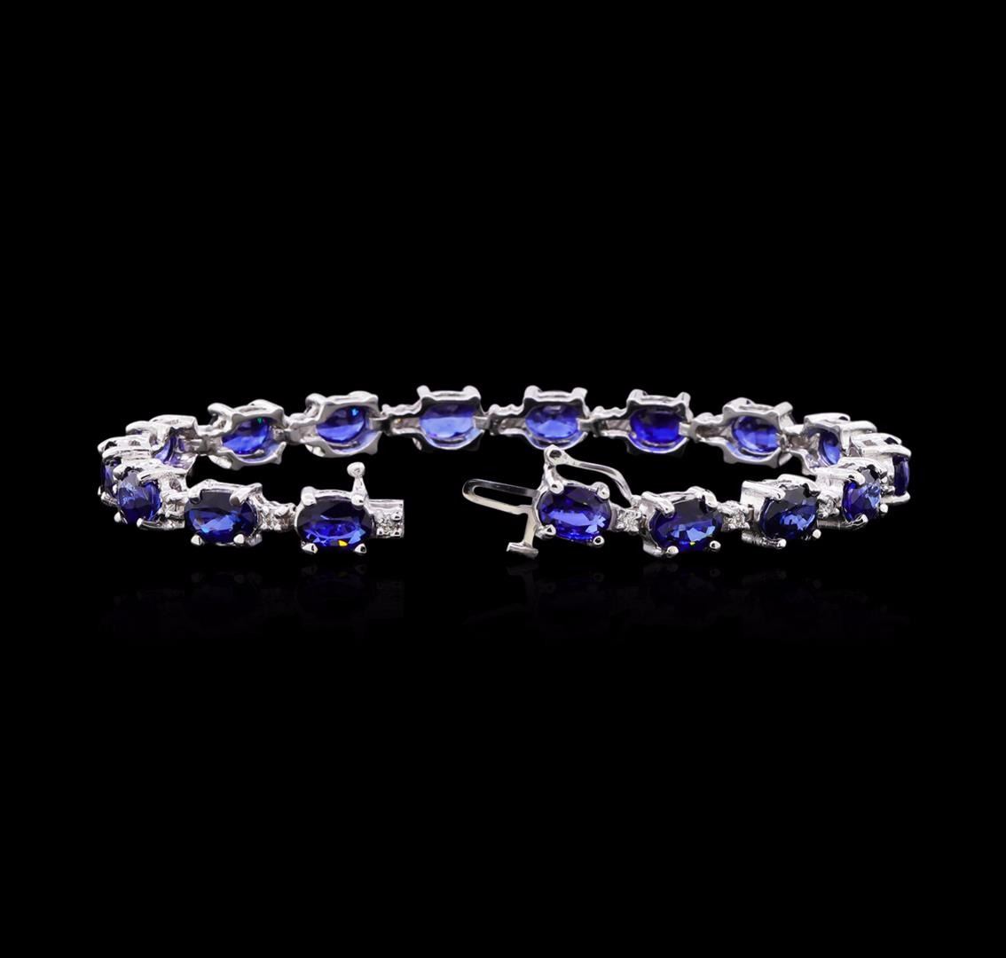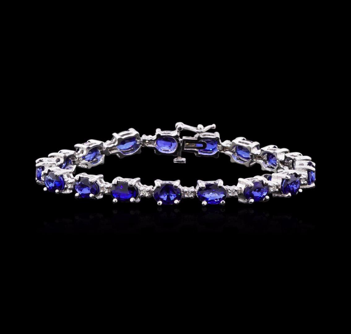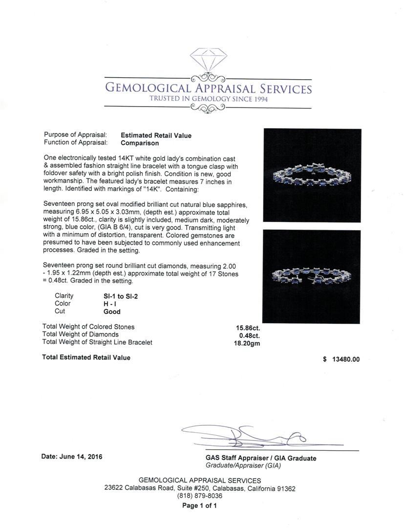 One electronically tested 14KT white gold lady's combination cast & assembled fashion straight line bracelet with a tongue clasp with foldover safety with a bright polish finish. The featured lady's bracelet measures 7 inches in length. Identified with markings of "14K". Condition is new, good workmanship. Containing: Seventeen prong set oval modified brilliant cut natural blue sapphires, measuring 6.95 x 5.05 x 3.03mm, (depth est.) approximate total weight of 15.86ct., clarity is slightly included, medium dark, moderately strong, blue color, (GIA B 6/4), cut is very good. Transmitting light with a minimum of distortion, transparent. Colored gemstones are presumed to have been subjected to commonly used enhancement processes. Graded in the setting. Seventeen prong set round brilliant cut diamonds, measuring 2.00 - 1.95 x 1.22mm (depth est.) approximate total weight of 17 Stones = 0.48ct. Graded in the setting. Clarity: SI-1 to SI-2. Color: H - I. Cut Good. Total Weight of Colored Stones 15.86ct. Total Weight of Diamonds 0.48ct. Total Weight of Straight Line Bracelet 18.20gm. GAS Appraised at $13,480.00.