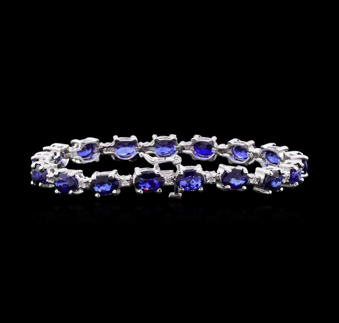 One electronically tested 14KT white gold lady's combination cast & assembled fashion straight line bracelet with a tongue clasp with foldover safety with a bright polish finish. The featured lady's bracelet measures 7 inches in length. Identified with markings of "14K". Condition is new, good workmanship. Containing: Seventeen prong set oval modified brilliant cut natural blue sapphires, measuring 6.95 x 5.05 x 3.03mm, (depth est.) approximate total weight of 15.86ct., clarity is slightly included, medium dark, moderately strong, blue color, (GIA B 6/4), cut is very good. Transmitting light with a minimum of distortion, transparent. Colored gemstones are presumed to have been subjected to commonly used enhancement processes. Graded in the setting. Seventeen prong set round brilliant cut diamonds, measuring 2.00 - 1.95 x 1.22mm (depth est.) approximate total weight of 17 Stones = 0.48ct. Graded in the setting. Clarity: SI-1 to SI-2. Color: H - I. Cut Good. Total Weight of Colored Stones 15.86ct. Total Weight of Diamonds 0.48ct. Total Weight of Straight Line Bracelet 18.20gm. GAS Appraised at $13,480.00.