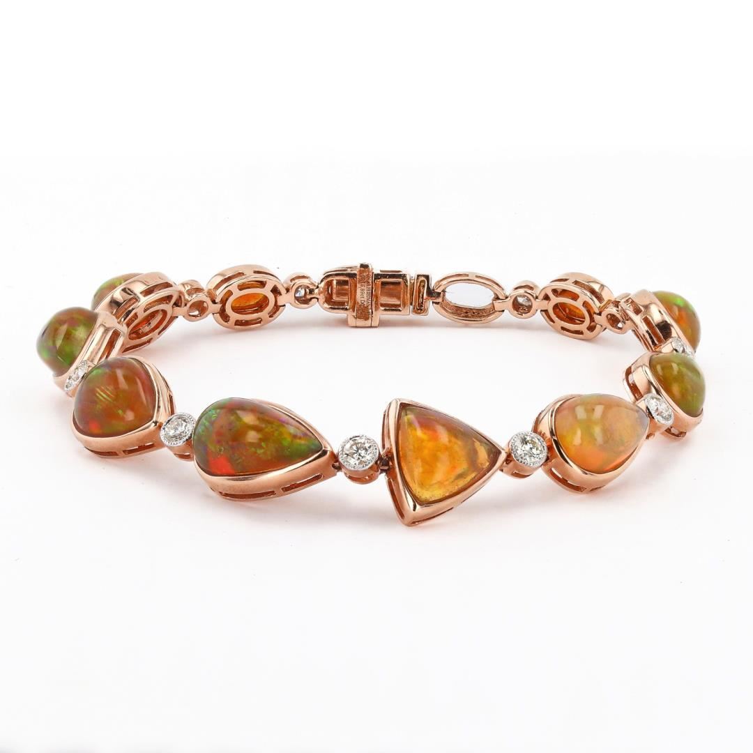 DESCRIPTION : ONE 14K ROSE GOLD LADY'S CUSTOM MADE DIAMOND & OPAL BRACELET . 18.40 GR TW . 7" LONG #1 - MAIN GEMSTONE# IDENTITY : ALL NATURAL OPALS SET IN BEZEL SETTING STYLE CARAT WEIGHT : 15.89 CTS . 10 COUNTS SHAPE & MEASUREMEMT : MIXED SHAPES QUALITY : GOLDEN OPALS WITH MULTI PLAY OF COLORS #2 - ADJACENT GEMSTONES# IDENTITY : NATURAL DIAMONDS SHAPE : ROUND BRILLIANT CUT CARAT WEIGHT : 0.84 CTS QUALITY : VS2 CLARITY RANGE . I/J COLOR RANGE ALL FINE CUTTING AND PROPORTIONS TOTAL GEMSTONES WEIGHT : 16.73 CTS TW. BRAND: Oscar Friedman Size: 7